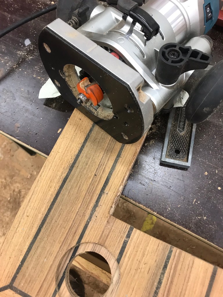 Eero hjälper med att borra hålen som pensionären märkt ut. Beslaget skall sedan sänkas i durken, det betyder att fräsen tas fram. Eero gör den ena sänkningen och pensionären får själv göra den andra. Igen en farlug maskin!