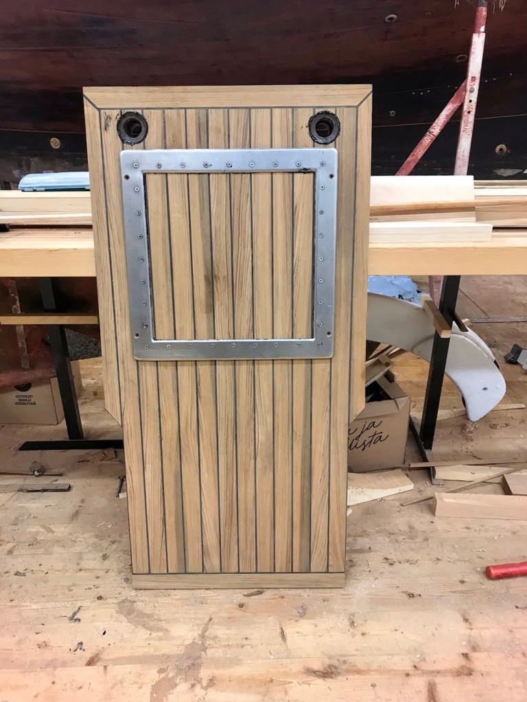 I bara farten limmas och skruvas ännu luckans ram fast, durken torde vara klar att limmas fast i morgon. Ännu linoljestryks styrbords sida en tredje gång och babords en nionde.