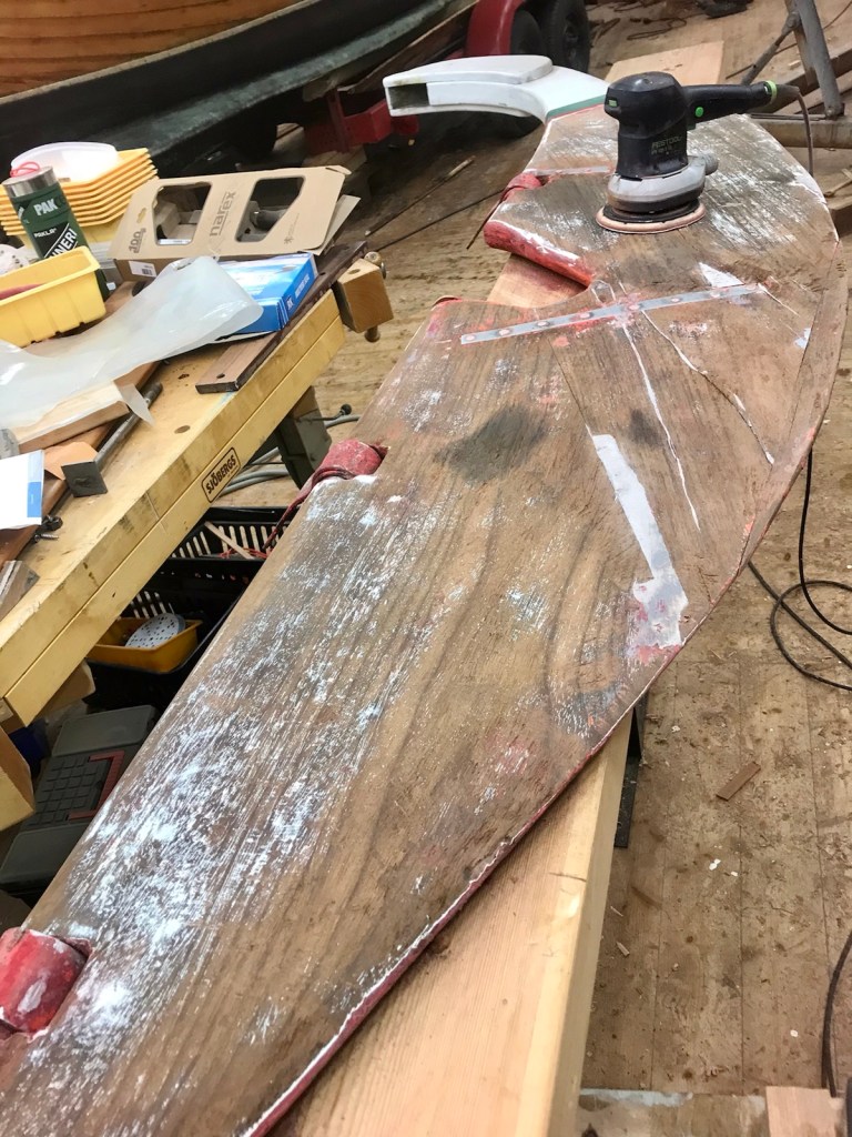 Det är i risigare skick än befarat. Slöslipning inleds. Gustav har bakat in sitt roder i epoxy, ett alternativ?