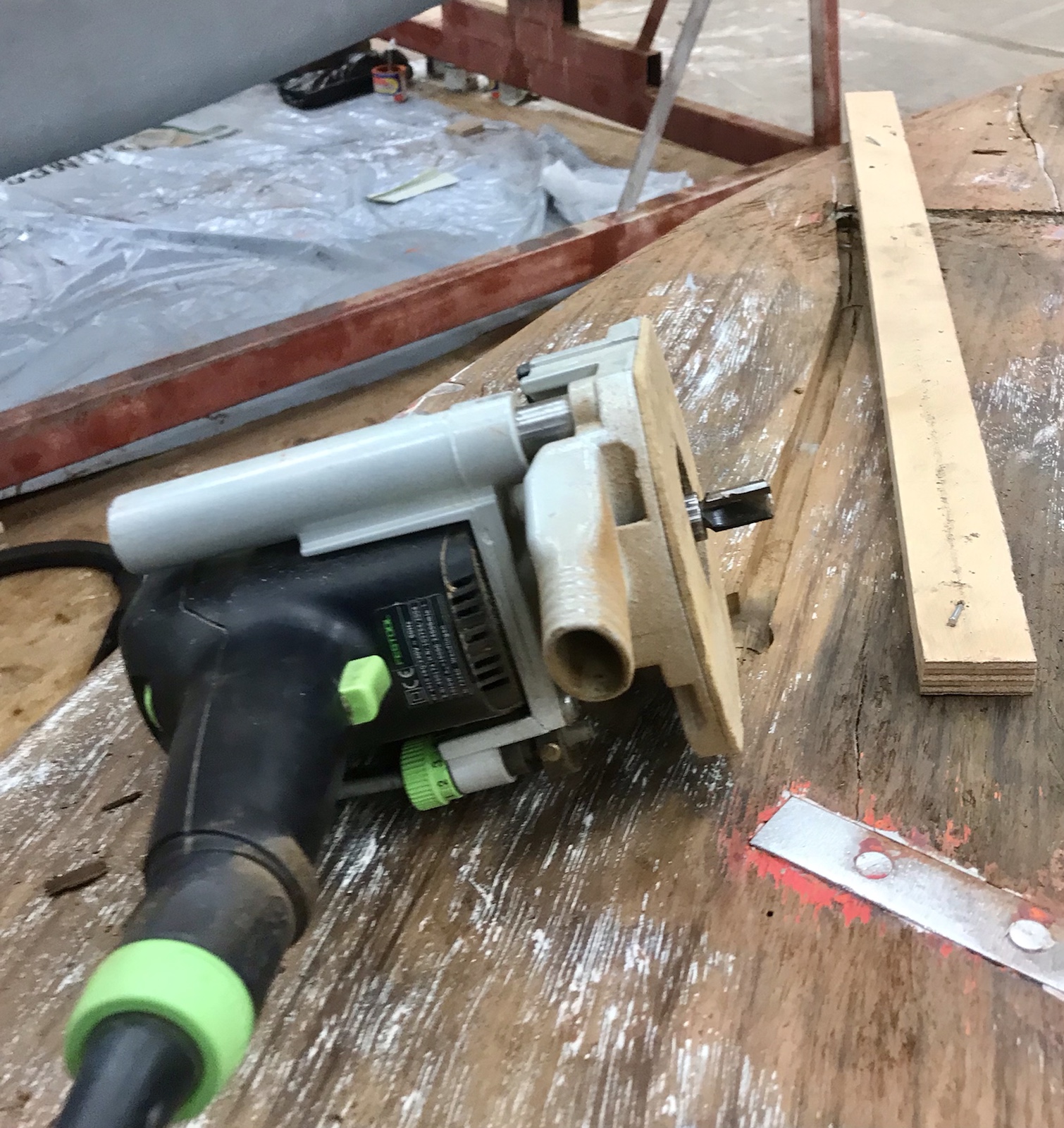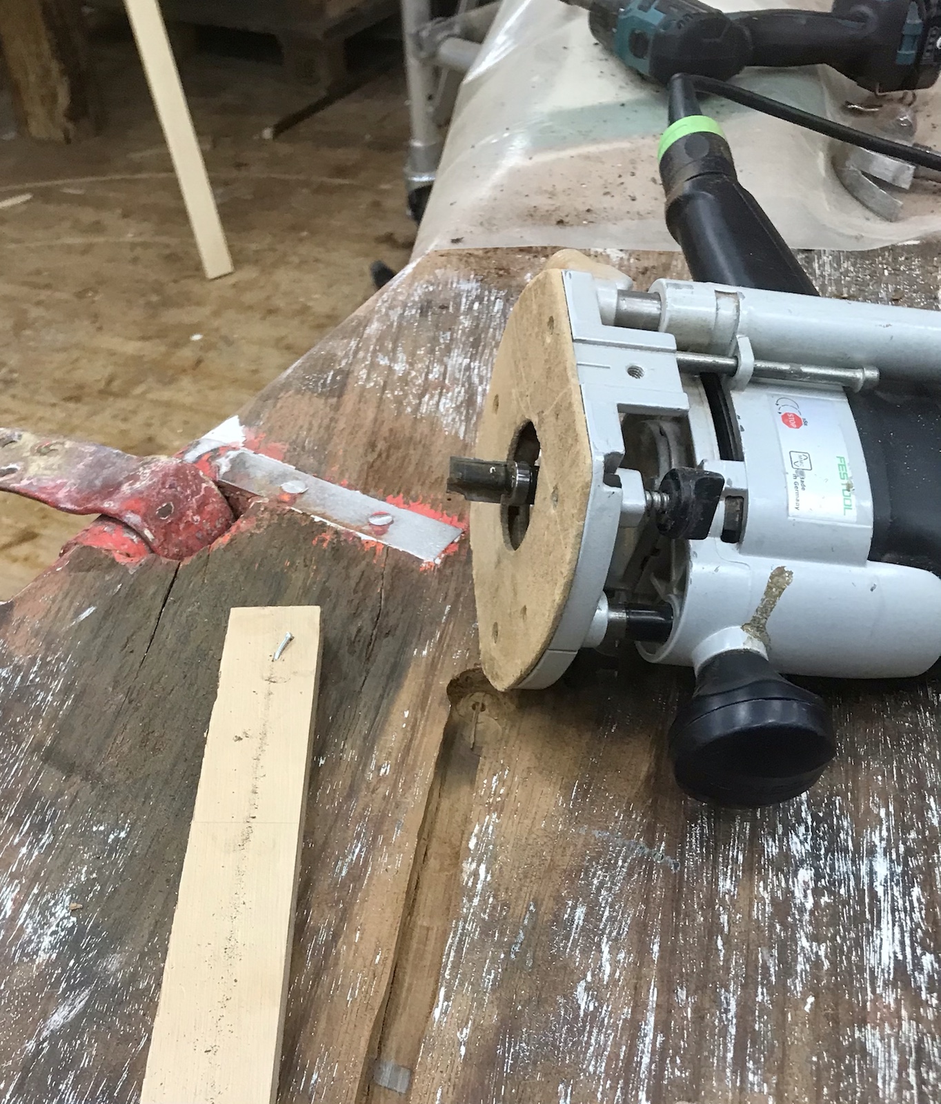 Ett nytt bett anbringas och nu går det som en dans. Insänkningar körs överallt där sprickor syns. Rodret är i iroko, Eero råkar ha en bit som sågas och hyvlas till lister som limmas i skårorna.