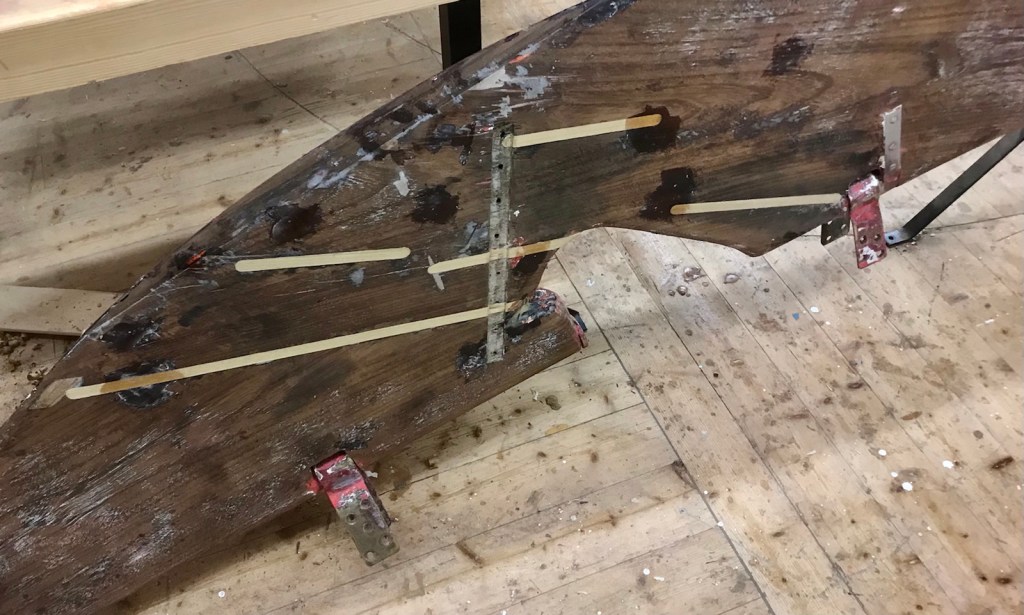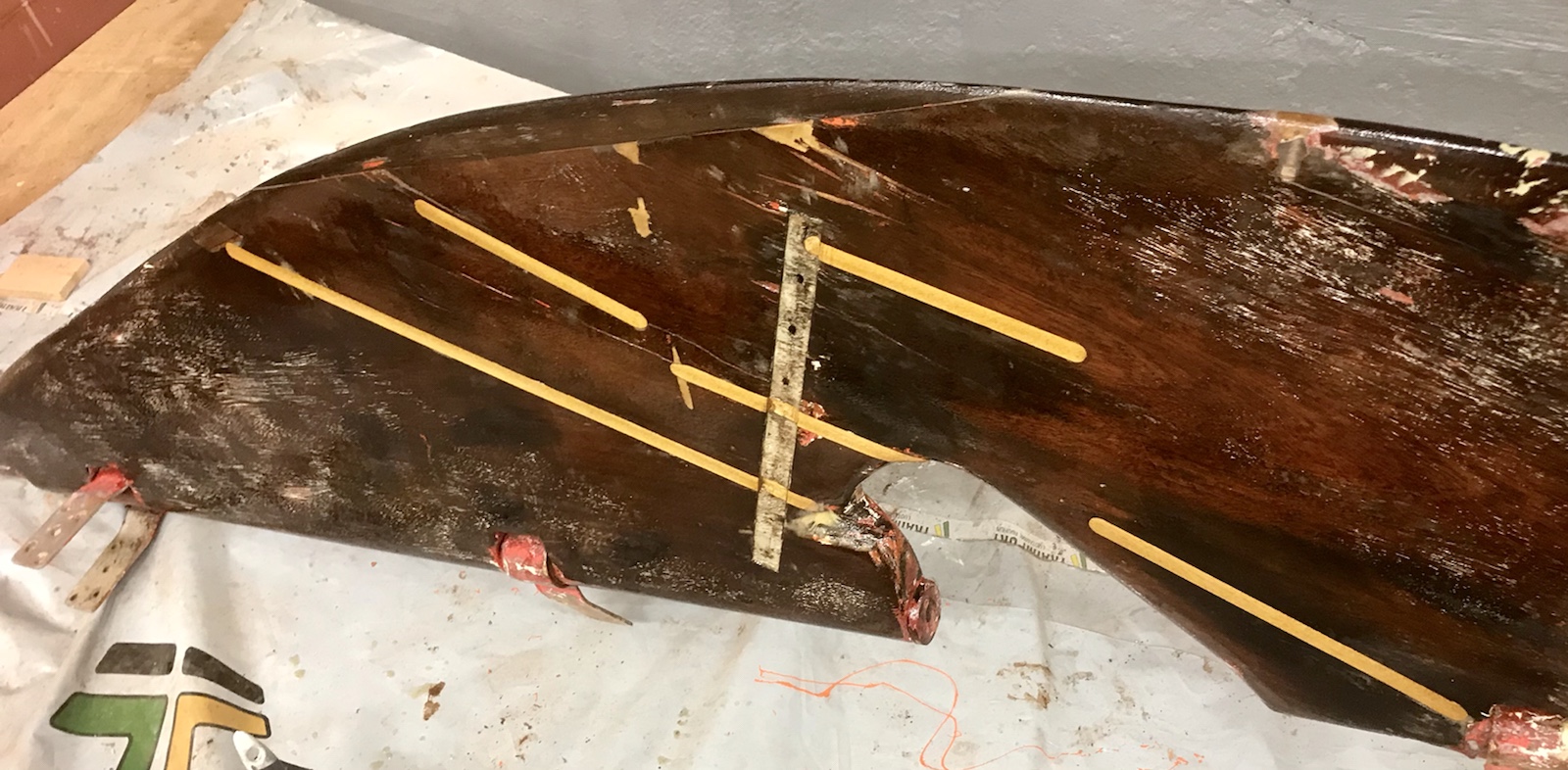 Gårdagens limning slipas och bitar fälls in på andra sidan roderbladet för att i sin tur slipas i morgon. Det blir inte vackert, men lapparna syns inte när de har målats.