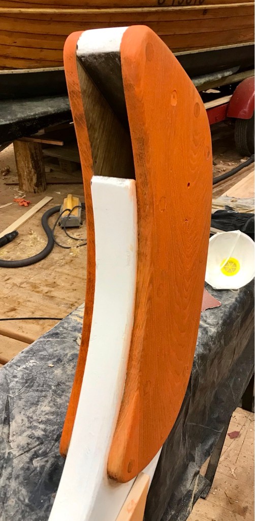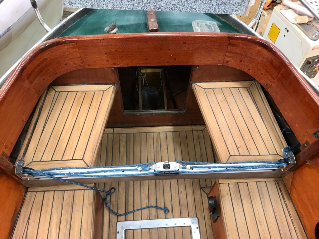 Ledaren för ankarkättingen får en ny bottenplatta i mahogny. Det skulle behövas ett beslag i syrefast stål vid sidan om peket för ankaret.
