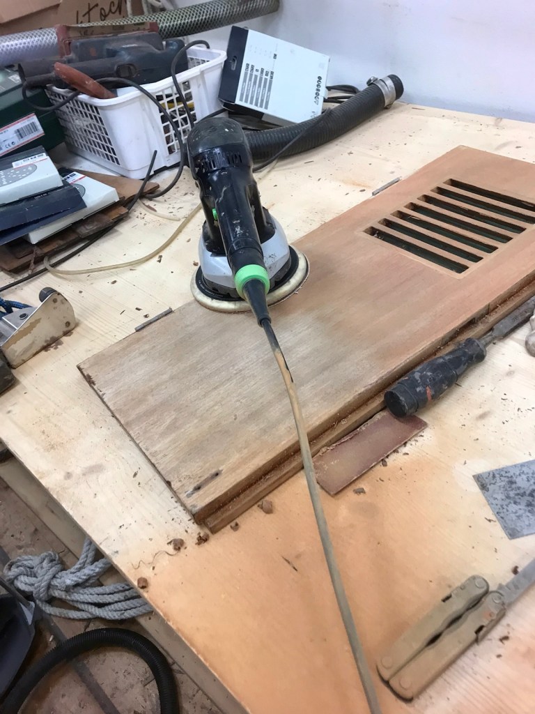 Dörrar och luckor slipas och lackas. Det gamla Rylard-lacket blir inte bra, i morgon får det bli rollern och den andra burken, den som gett en jämnare yta.