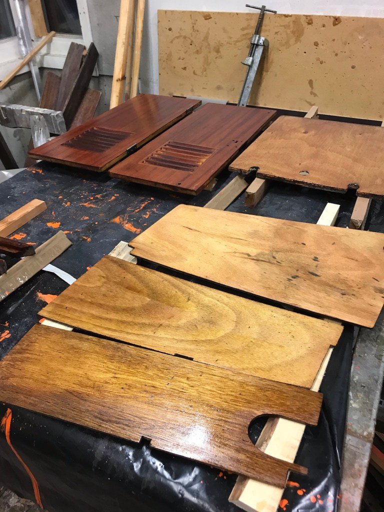 Dörrarna betsas och lackas, men det ser så jävligt ut att allt putsas bort för att slipas rent.