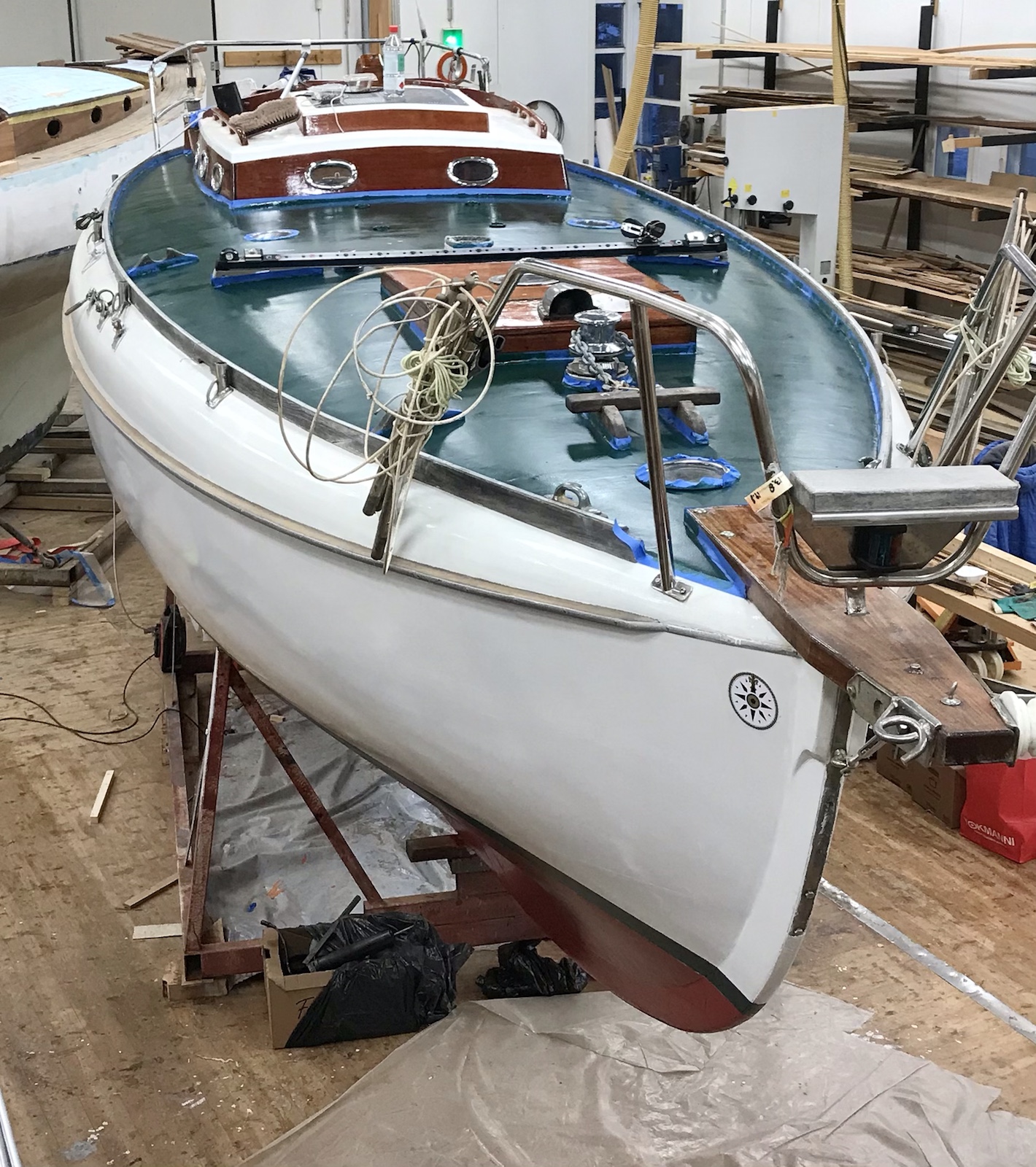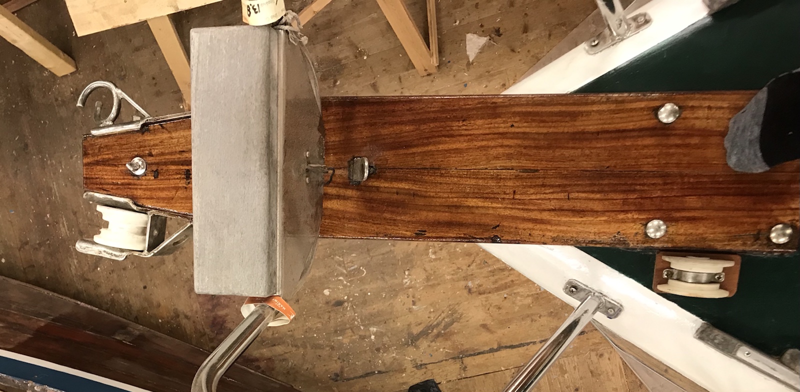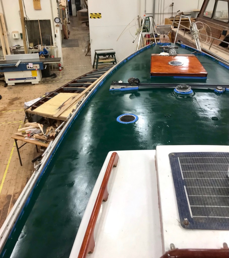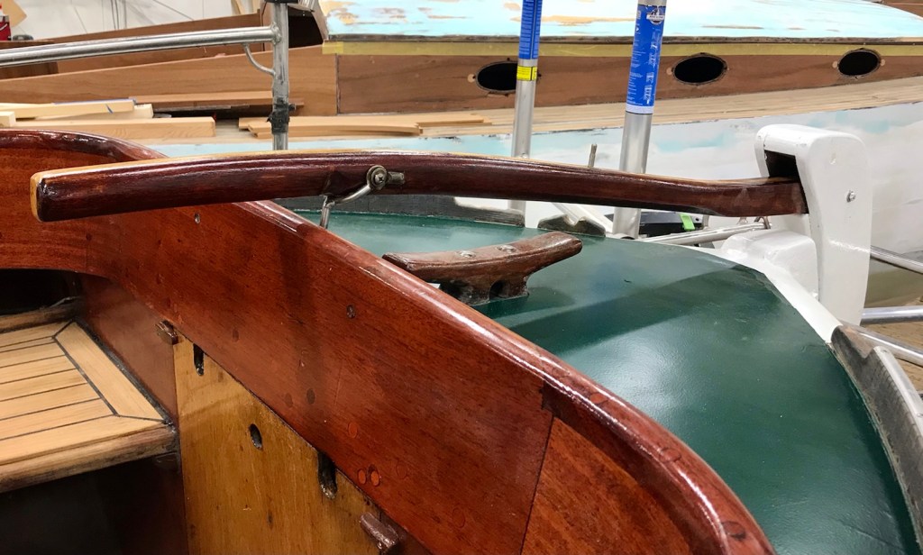 Tejpningen avlägsnas från däcket. Skruvhålen efter löstagna beslag proppas för att skruvarna skall ta bättre. Åran/båtshaken lackas en gång till liksom dörrarna.