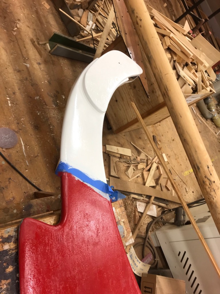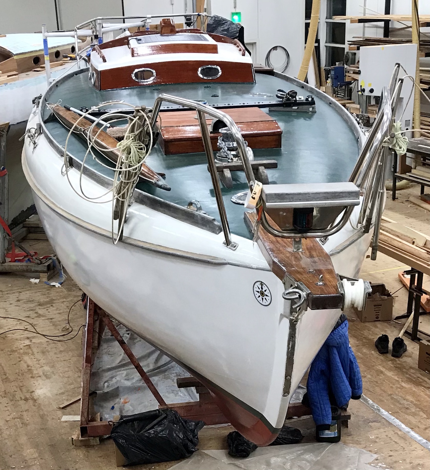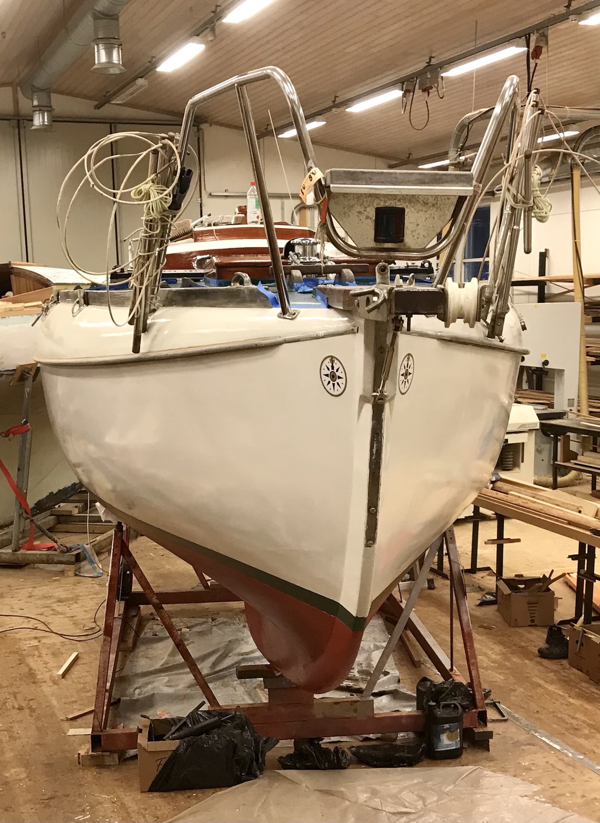 Tejpningen avlägsnas från däcket. Skruvhålen efter löstagna beslag proppas för att skruvarna skall ta bättre. Åran/båtshaken lackas en gång till liksom dörrarna.