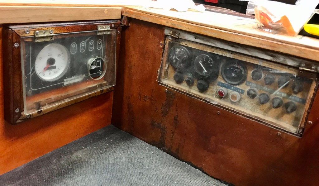 Skydden för instrumentpanelerna monteras efter matpausen. Ännu tejpas den övre delen av vattenlinjen för att målas i morgon. Sedan får det räcka för idag.