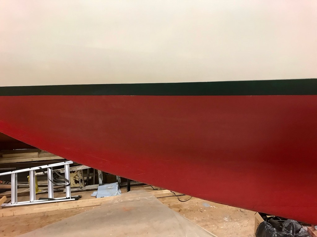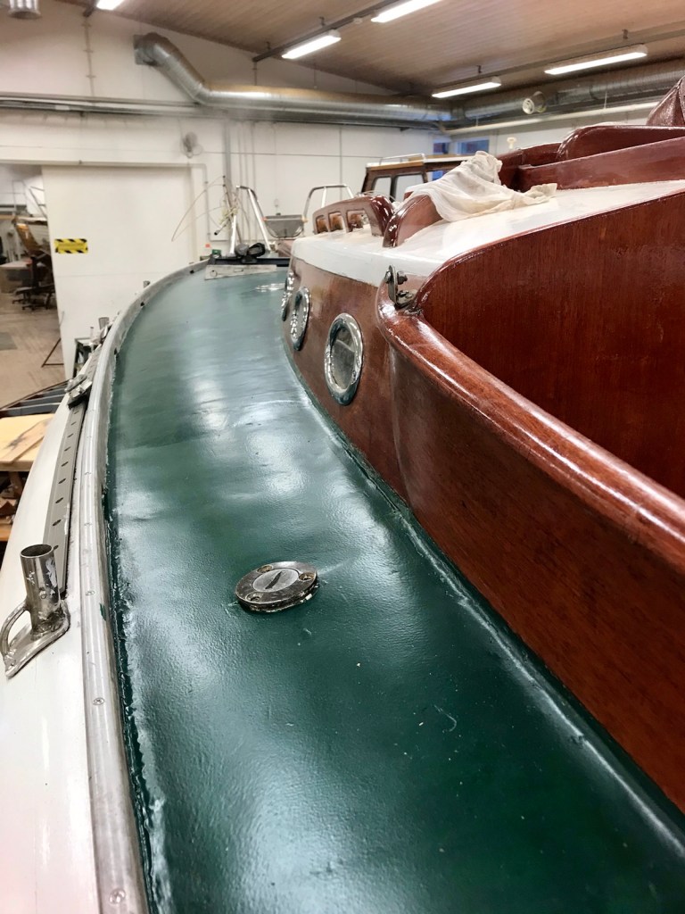 Vattenlinjen målas på nytt, nu med täckande färg. När det nu finns grön färg målas däcket i samma veva.
