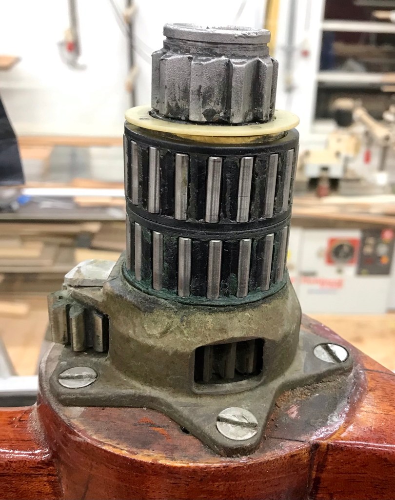 Till slut tas wincharna i sär för att smörjas. Pensionären vågar inte ta loss alla delar utan klämmer lite vaselin på kugghjulen och packar ihop igen.