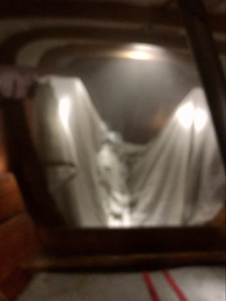 Till slut breder pensionären ut våta gardiner i förpiken och i aktern för att fukten någorlunda skall bibehållas.