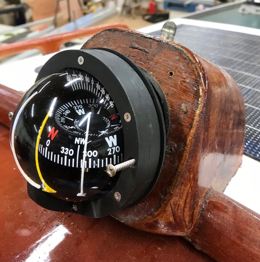 Att montera den nya kompassen är inte så lätt som man kunde tro. Eftersom den har lampan på undre sidan ser man inte gradtalen från styrmans plats. Fundamentets lutning är för stor. Och den nya kompassen går inte att vända upp och ned som det gick med den gamla. En skruv öppnas för att undersöka. Det visar sig vara påfyllningsintaget för vätska. En droppe rinner ut och ersätts med en liten luftbubbla.
