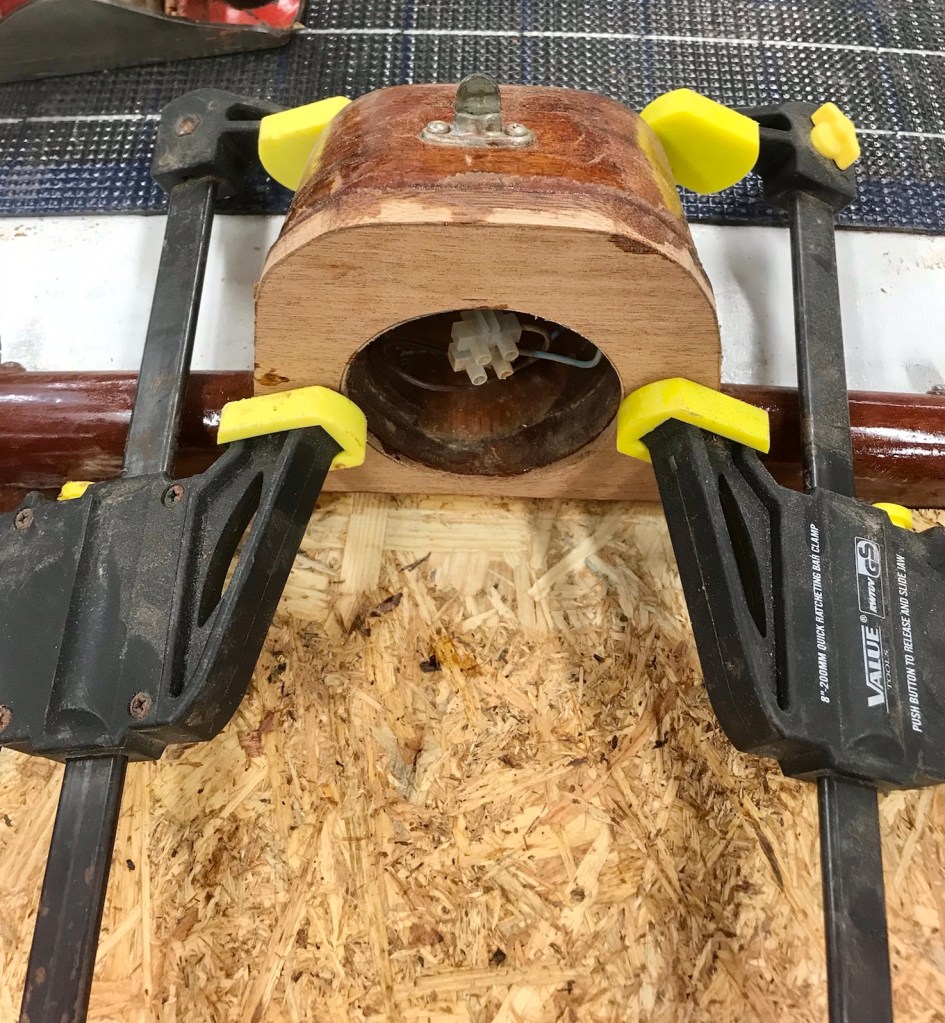 Det visar sig att ”skruvtvingarna” från Motonet inte håller måttet, alldeles som Eero sagt. En ordentlig läggs till medan epoxyn ännu är någotsånär mjuk. Hoppeligen inte för sent.