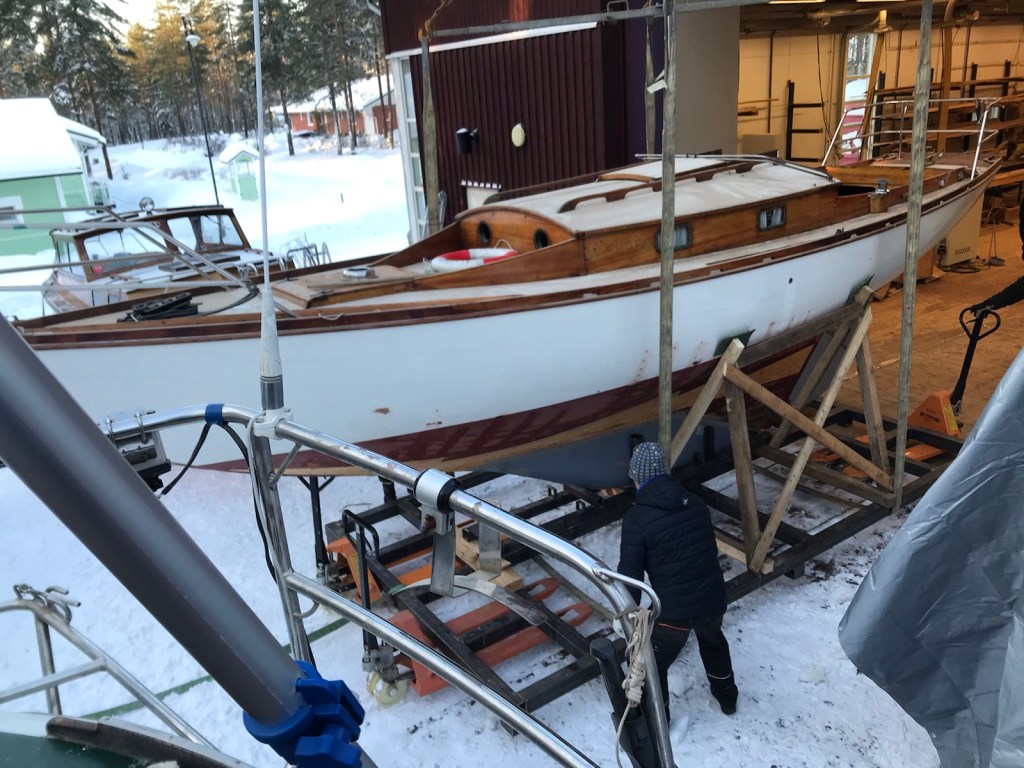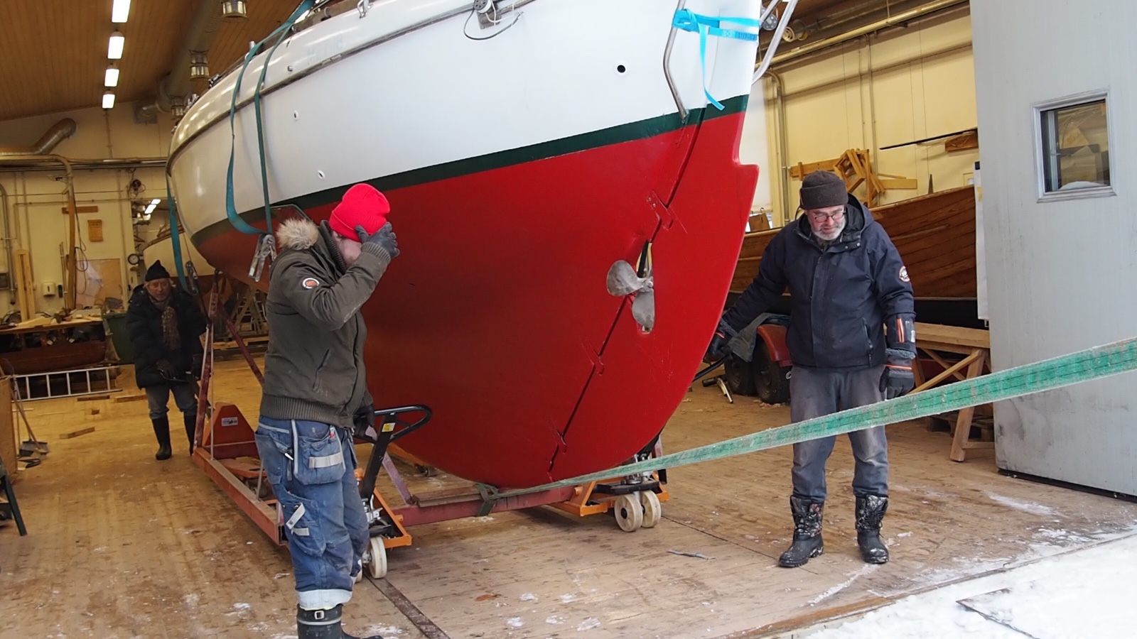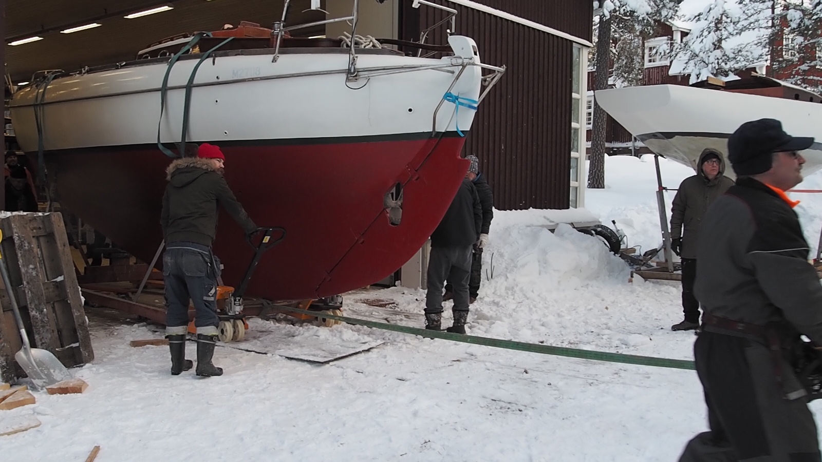 Härpå kommer Jarkkos båt ut i det fria. Den lyfts bredvid Freja. Simos båt står på trailer och släpas ut med traktor. Sedan börjar hallen fyllas med motorbåtar som skall renoveras under vårterminen.