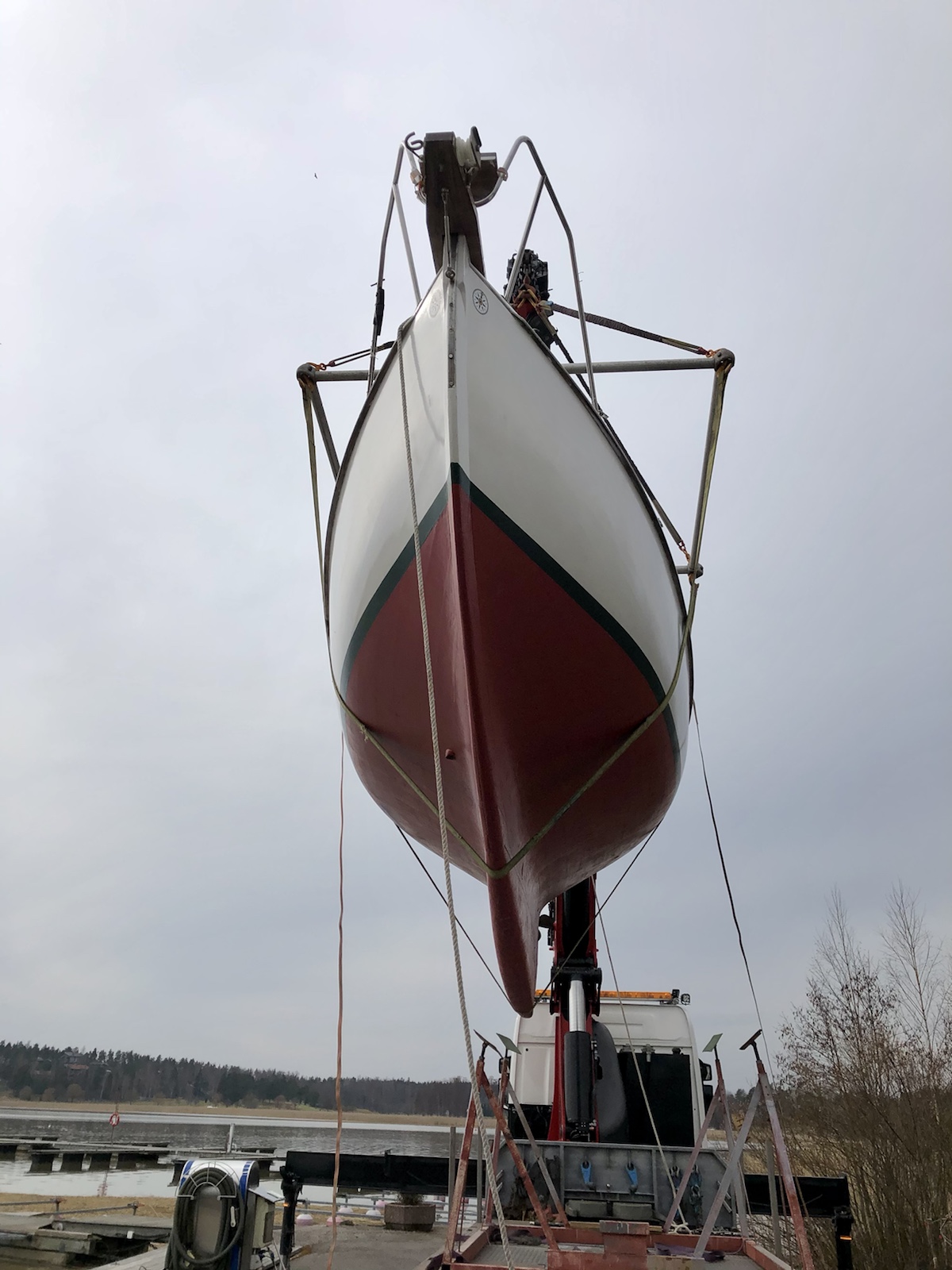 Väl framme lyfts båten i sjön. Därefter kommer masten.