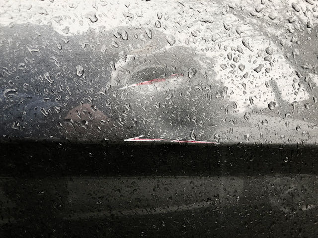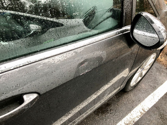 Grannen var oförsiktig då han öppnade sin bildörr, vinden tog i och slog den mot Forden som nyss fått sina sommardäck. Fula märken i höger dörr: