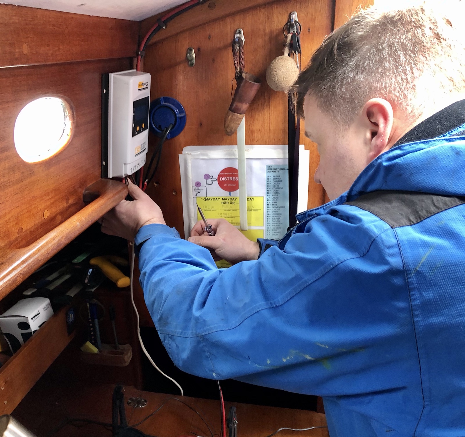 Ett försök att gömma solpanelens sladdar i ett rör utfaller skapligt.