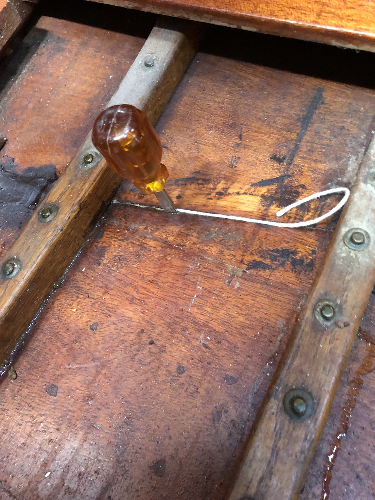 Dagens uppgift är att skruva bort en planka som döljer bordläggningen inifrån, skrapa bort den massa som med möda applicerats föregående dag och i stället försöka trycka in bomullsgarn i springan.