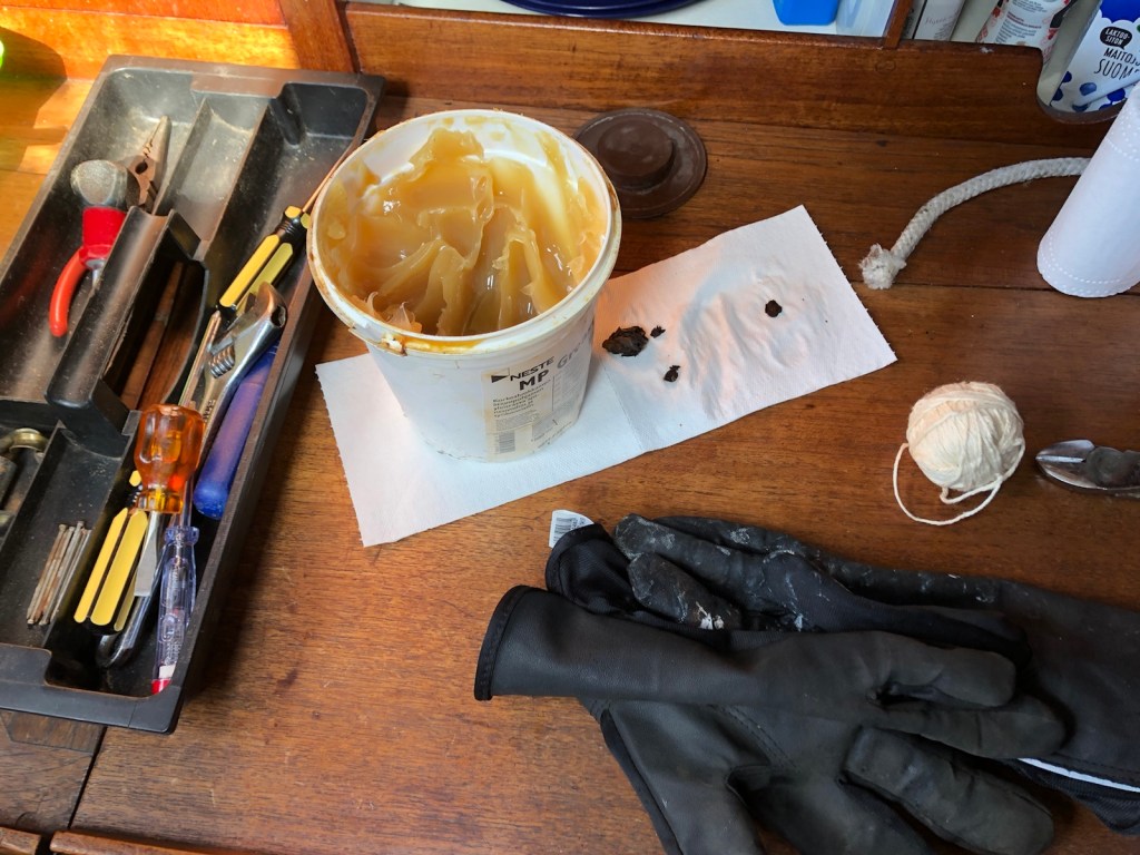 Wallas-värmaren för ett ohyggligt ljud och motorn startar först på n-te försöket. Förluckans glugg läcker som sagt men kan inte tätas pga fukten. Likaledes kommer det in vatten i lådan till babord i sittbrunnen. Fatet under gasflaskan är halvfyllt.