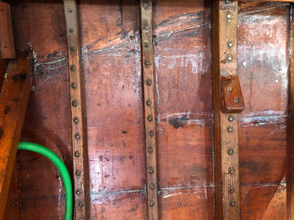 Flödet avtar ytterligare, men det är svårt att täta under spanterna så längs dem rinner ännu lite vatten.