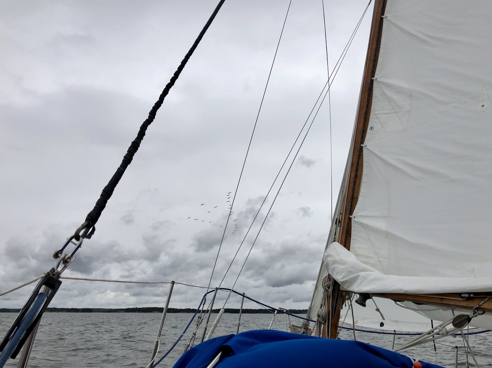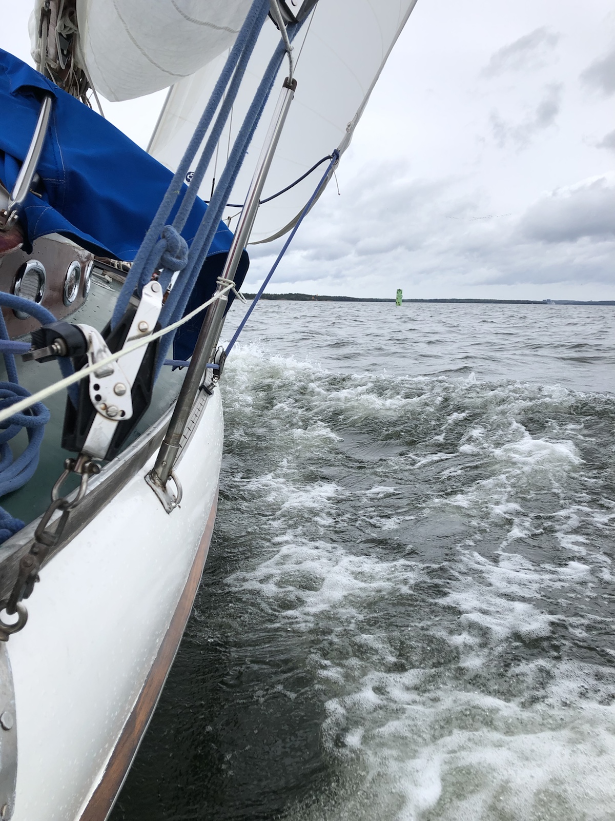 Det revade storseglet är inte ordentligt sträckt, men sträckan är inte lång. Efter Svinö kan seglen halas. Landningen är denna gång tämligen lyckad.