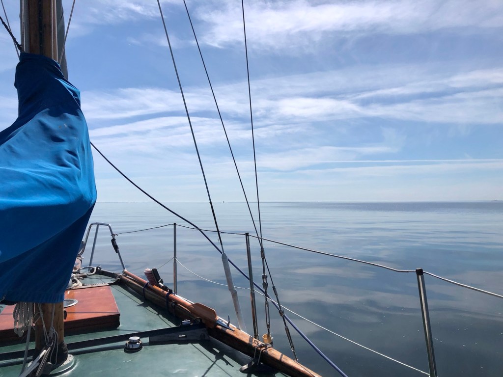 Han har svårt att somna men sover i stället länge. Morgondopp, -mål och -tidning, Klockan har redan hunnit bli 9. Iväg 9.20 i obefintlig vind.