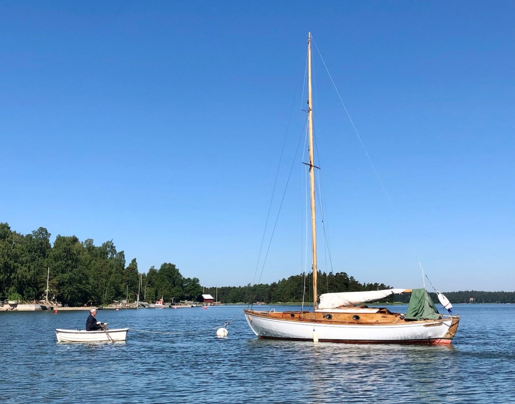 Tuomas tar rodret och njuter. Det blir en kort färd ut på Simsalöfjärden. Bojen tas för segel, färden sker helt utan motor. Som under den gamla goda tiden.