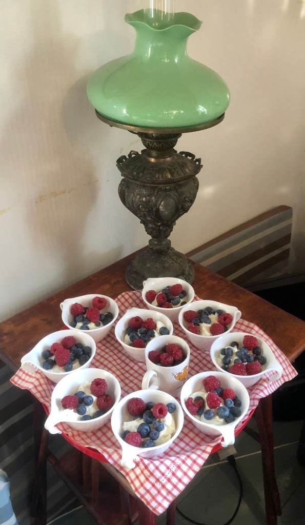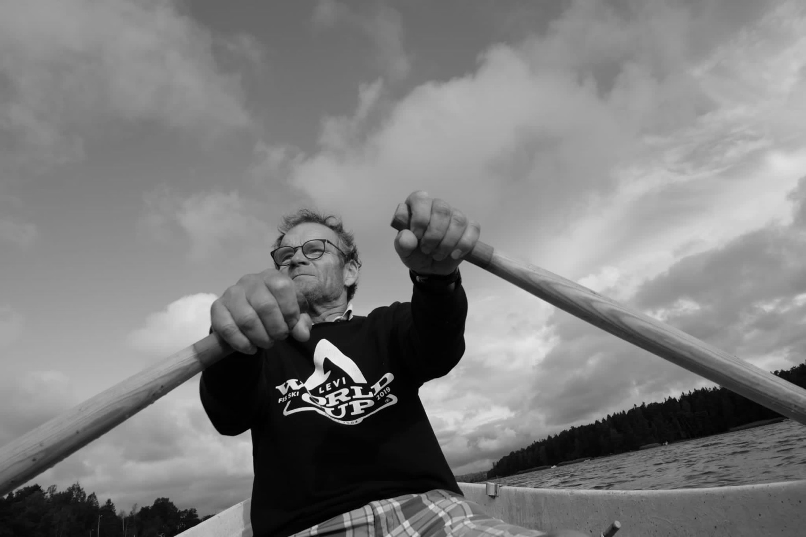 Butiksbåten kommer och han anser att roende är hur man skall ta sig dit. Syster och dotter hänger med. Dottern fotograferar.