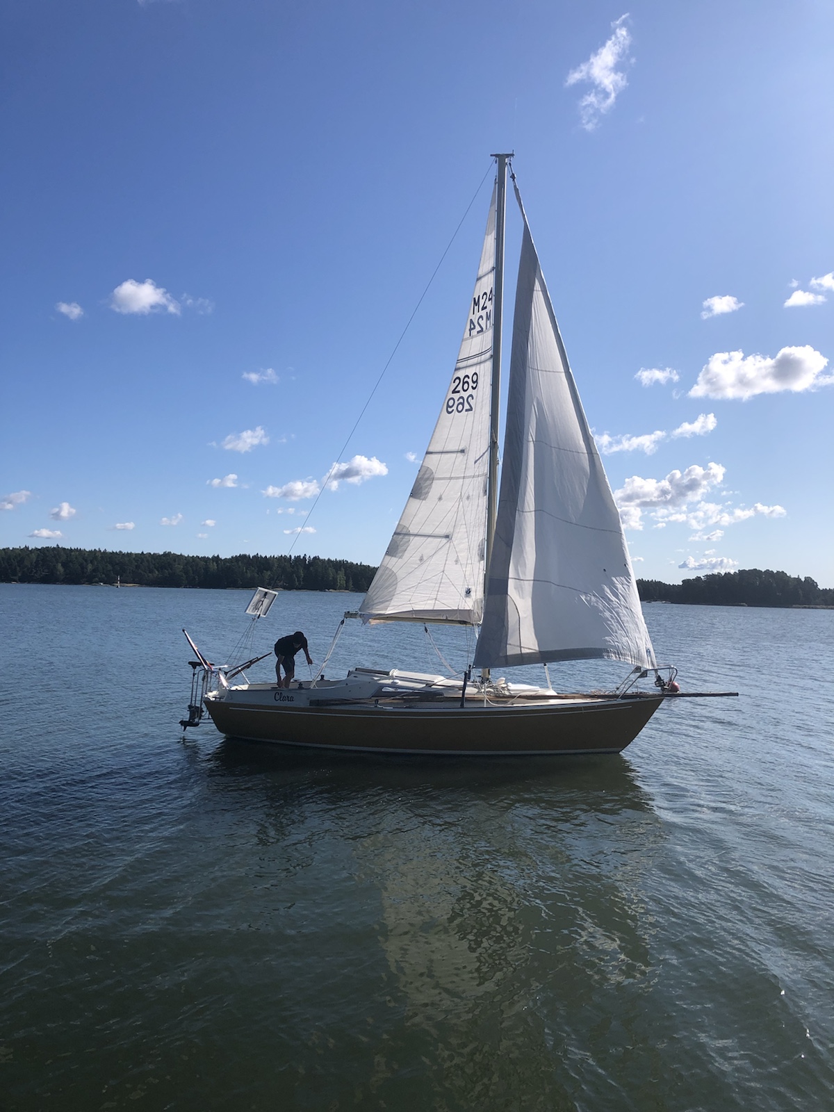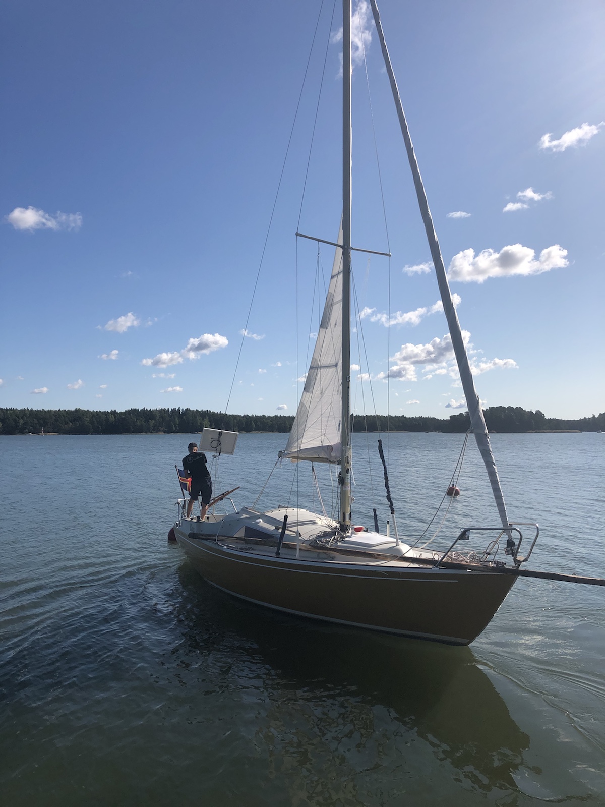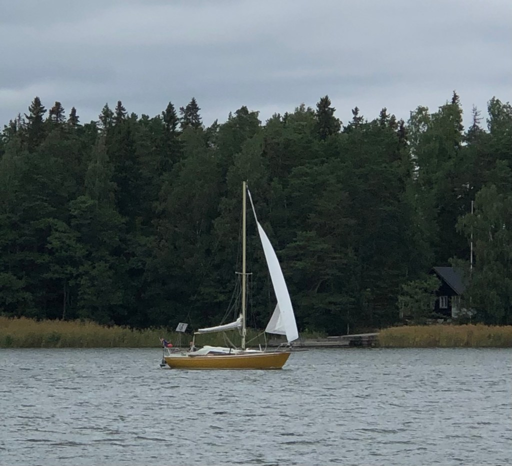 Han har kommit från Jakobstad via Mariehamn och har alla sina ägodelar ombord, jämte en lång granstam som skjuter ut likt ett bogspröt. Inne finns två stammar till. De skall bli mast och bom till hans nybyggda båt.