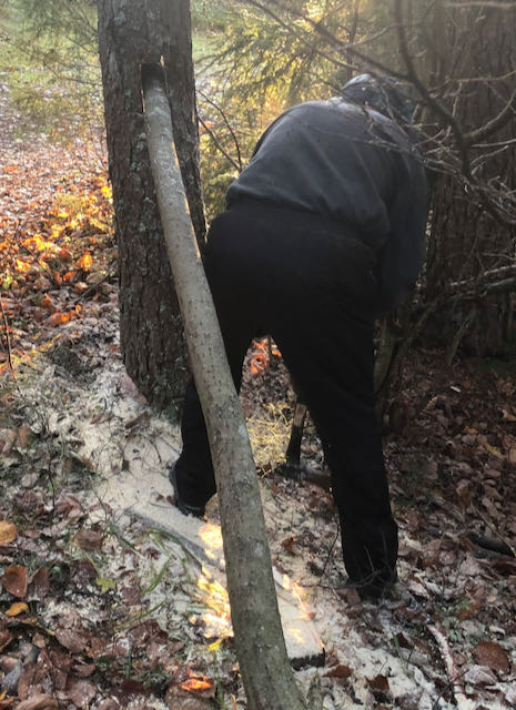 Medan han håller på att tillreda sin frukost knackar Timo på. Han skall börja fälla träd. Dagen innan hade han lämnat en påse äppel och en påse morötter på trappan medan pensionären var i skogen och letade svamp. Frukosten inmundigas snabbt och han går ut för att hjälpa Timo med avverkningen.