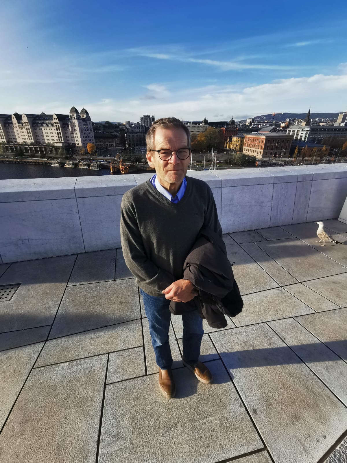 Utsikten är magnifik. Resenären vet fortfarande inte vad som planerats för honom. Benen börjar bli möra, men han följer efter sina guider. Målet visar sig vara Kunsthall Oslo.