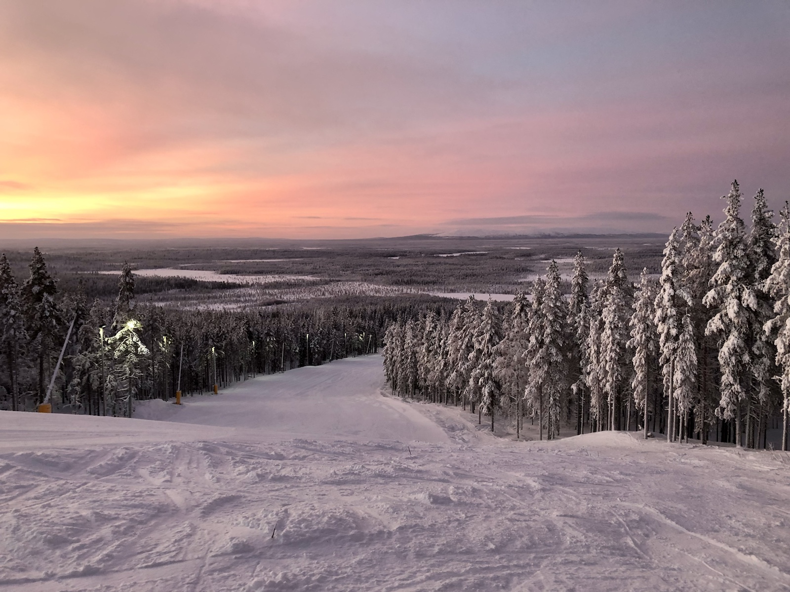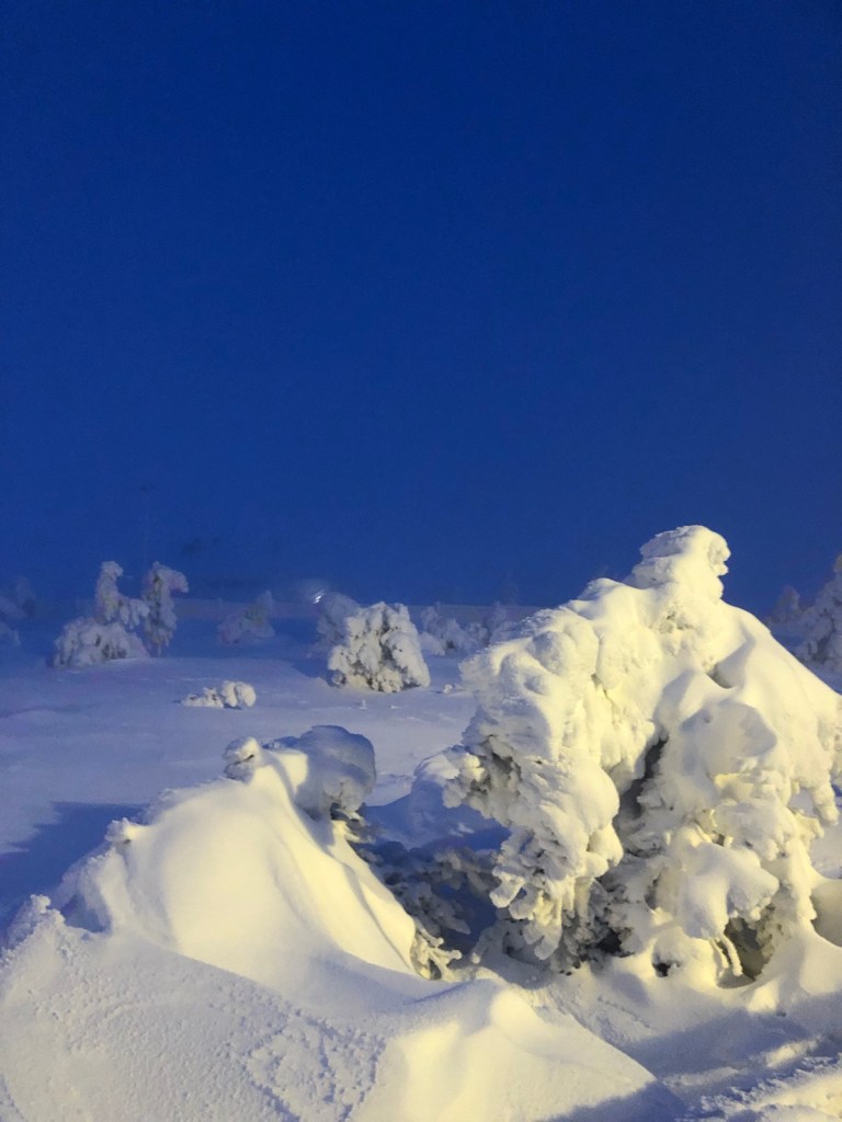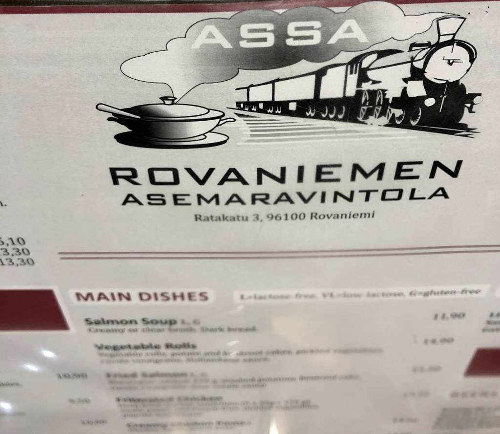 Nattåget till Rovaniemi med bilen i egen vagn. Morgonmål på Rovaniemen asemaravintola i sällskap med förvånansvärt många utlänningar.