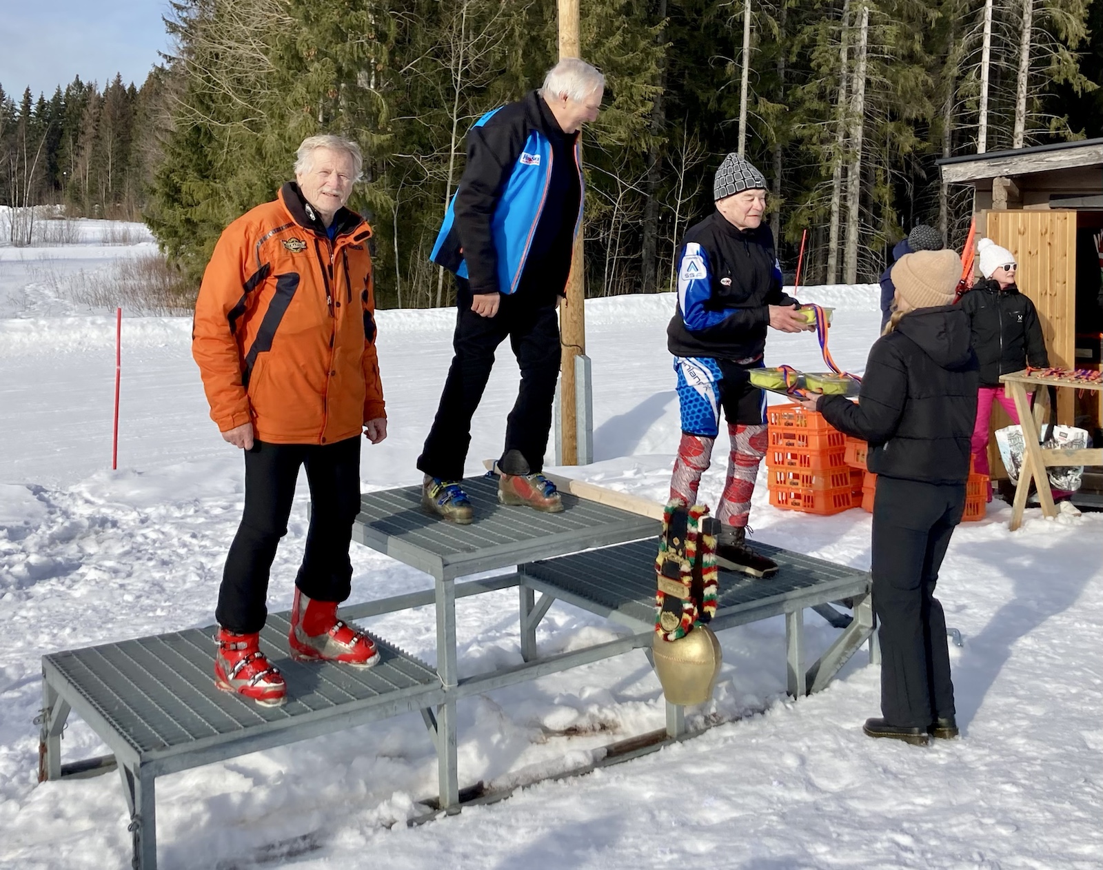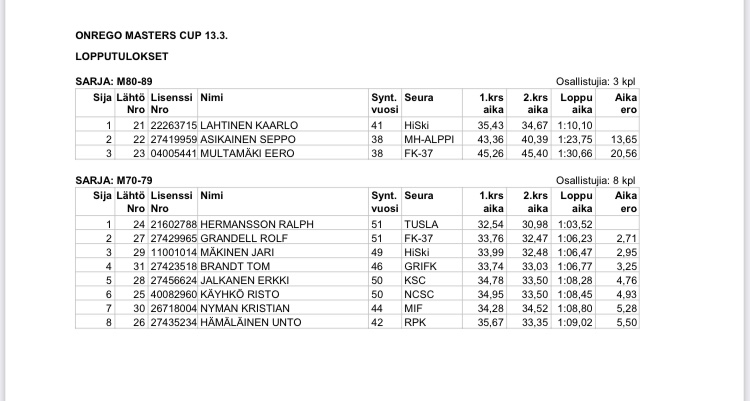 Han kan inte besluta sig om de gamla eller nya skidorna är bättre i banan. Det lutar mot de nya, de gamla ”släpper” på isigt underlag. Han lämnar dem åt Tom som har ordentlig serviceutrustning. Det är svårt att ge upp dem helt, han har ändå firat triumfer med dem, bl.a. FM för tre år sedan. Och eftersom mästerskapet inte har anordnats sedan dess pga pandemin har farfar varit regerande finsk mästare i slalom i klassen M65 i tre år.