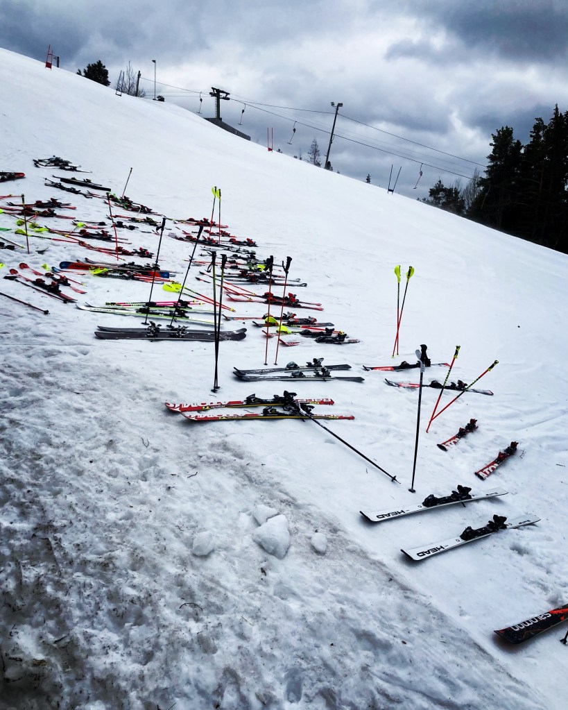 Klubben bjuder på delikat mat i pausen. Det blir trångt i stugan, så farfar äter ute på verandan. Efter tävlingarna blir det prisutdelning och stugan fylls på nytt. Sedan följer säsongavslutningsfesten! Farfar åker hem trots att han nog skulle få pris. Coronan har inte gett med sig ännu! Han gör enbart de gamla skidorna färdiga för morgondagens tävlingar. De nya är nog mera för friåkning.