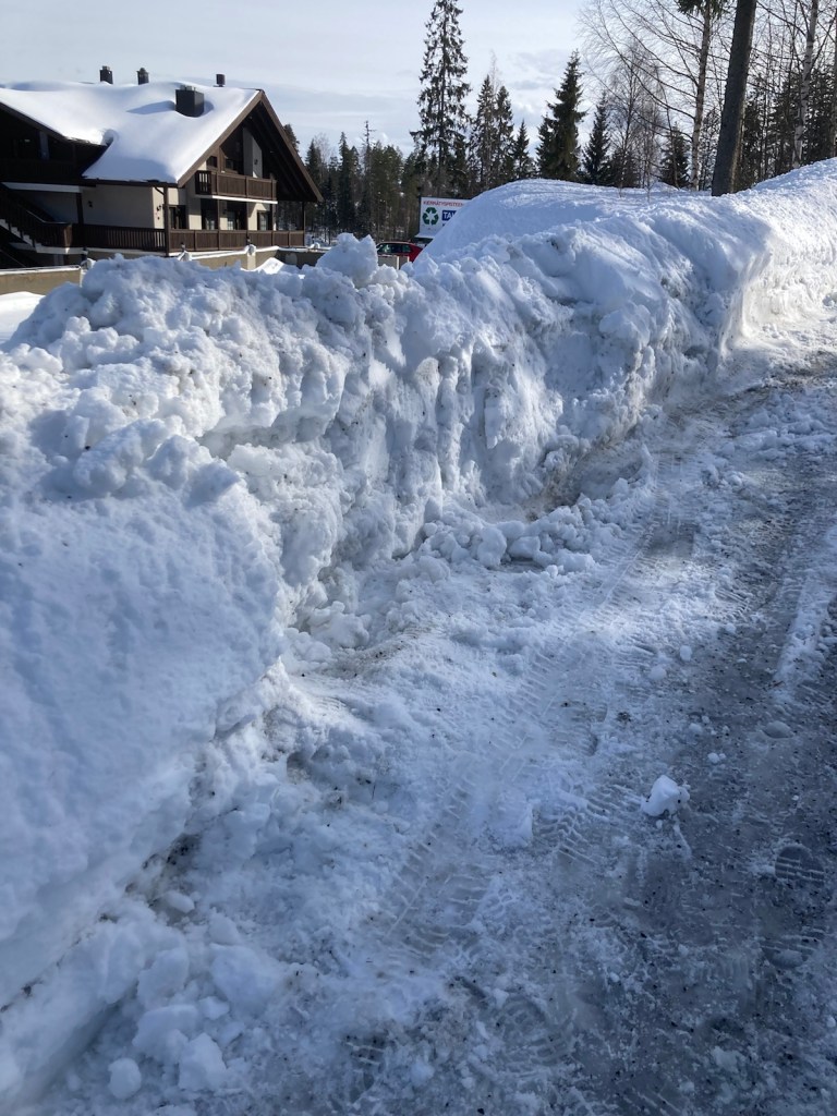 Han är först framme vid lägenheten som ligger uppe i en brant och kurvig backe. Han fastnar förstås i backen och bilen blir med förardörren mot drivan. Han får krypa ut över skidorna, ta fram spaden och skyffla undan snön. Till slut kommer ett äldre par och hjälper.