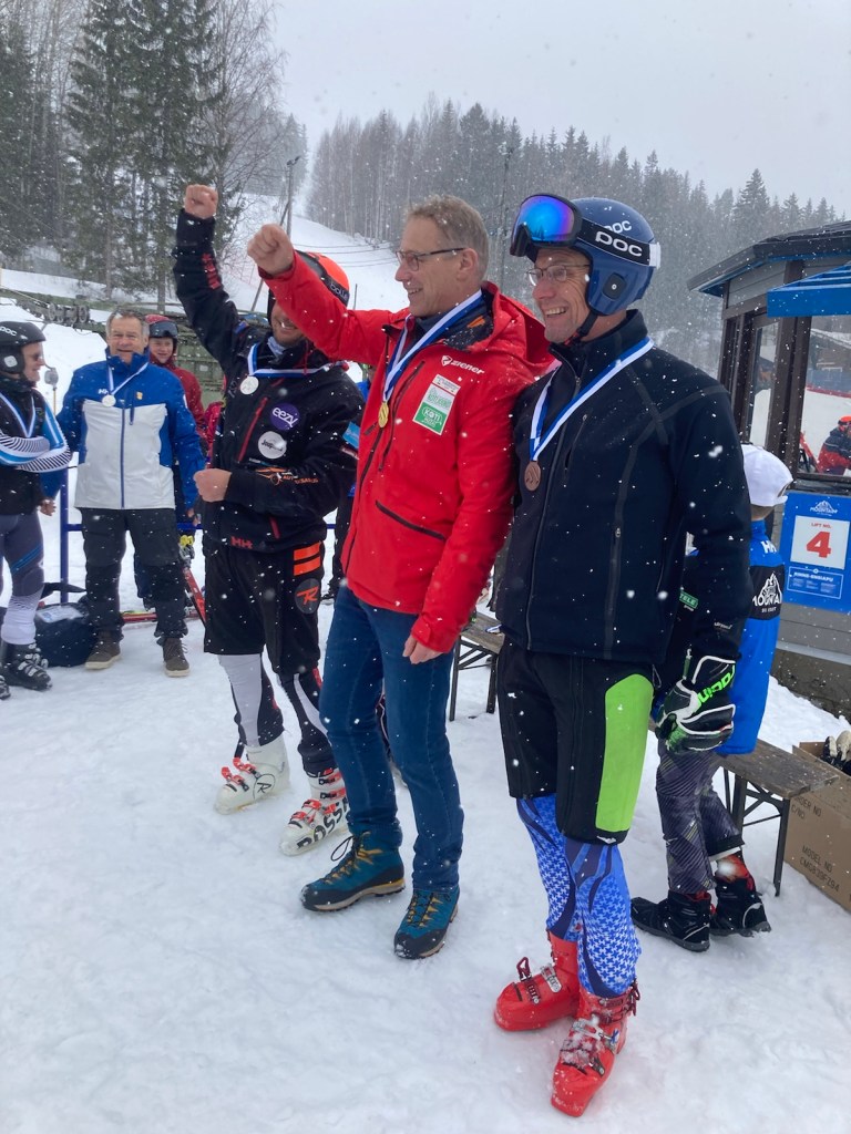 Och så går det som det kan gå, Jari är lite snabbare i det andra åket och vinner med 0,02 sekunder. Farfar åker som i en dröm. Långsamt och försiktigt.