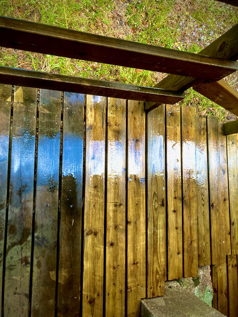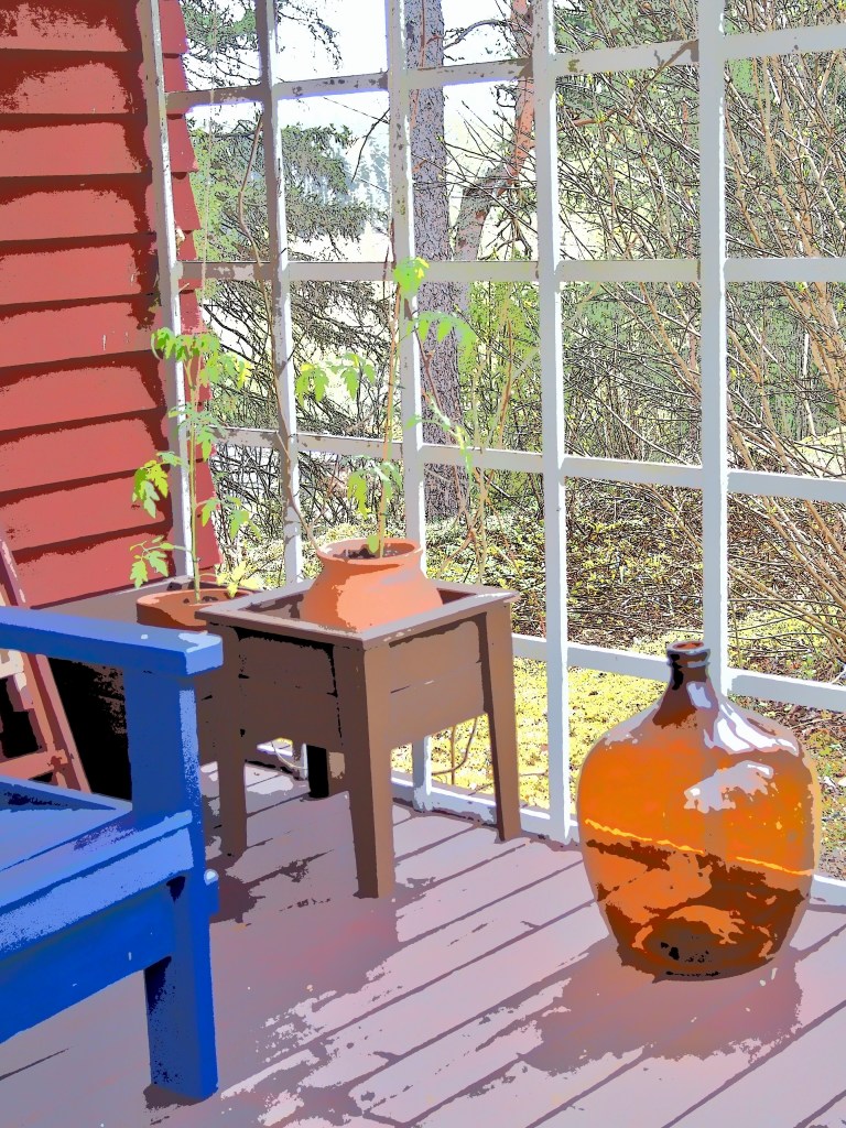 Vildvinet har vuxit vilt och han försöker ta bort det som har vuxit upp över taket och det som har torkat. Det blir inte mycket kvar. Han lägger de tomatplantor som han fått av Berndt dit i stället. Men på inre sidan.