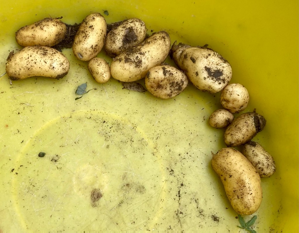 De första självodlade potatisarna bringar glädje trots att de ännu kunde anses för obetydliga för att nyttjas som människoföda.