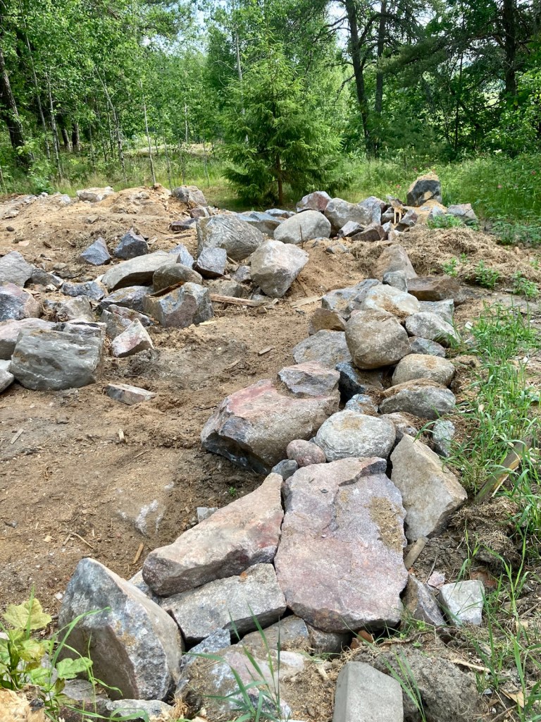 Stenhögen från rivningsgrunden är ett riktigt Sisyfos-arbete. Farfar vet att det aldrig blir färdigt men går dit och baxar på någon bumling med jämna mellanrum. Camus ansåg att Sisyfos kunde anses lycklig då han ständigt hade ett projekt framför sig trots att han visste att det aldrig kunde leda någon vart.