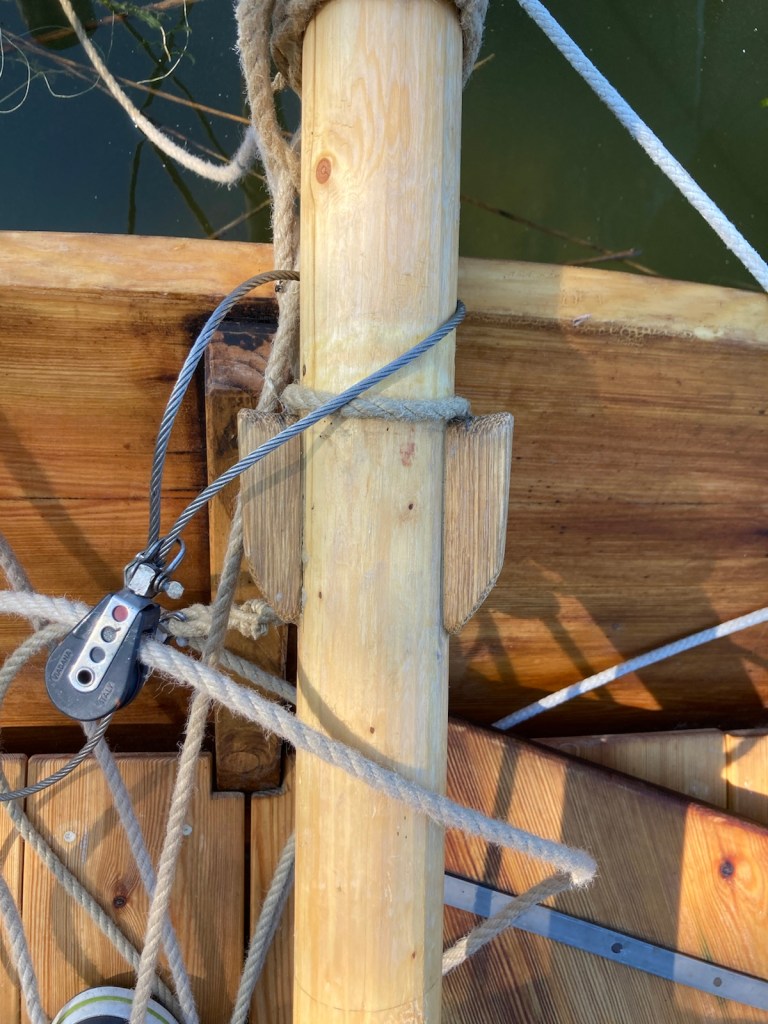 Han fäller ned masten för att undersöka hur han skall höja fästpunkten för vanterna och storfallets block. Det krävs för att storseglet skall kunna hissas ända upp.