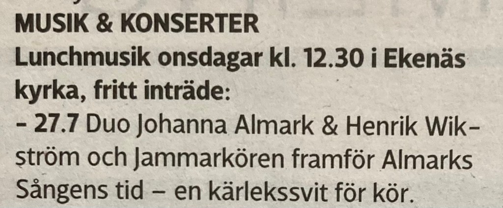 Det blir en heldag med körsång. Först övning i Ekenäs kyrka, sedan konsert.