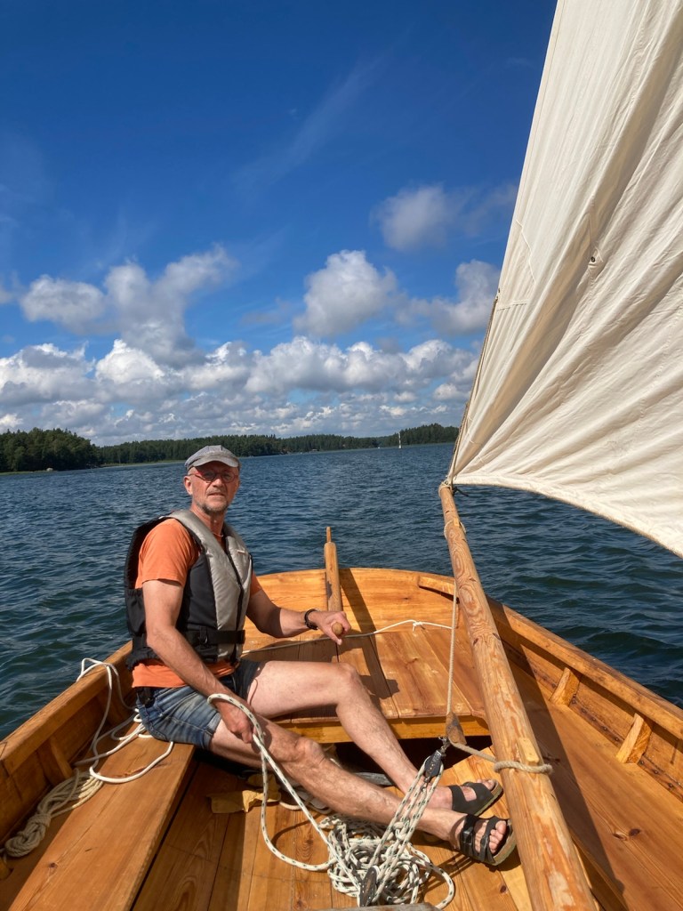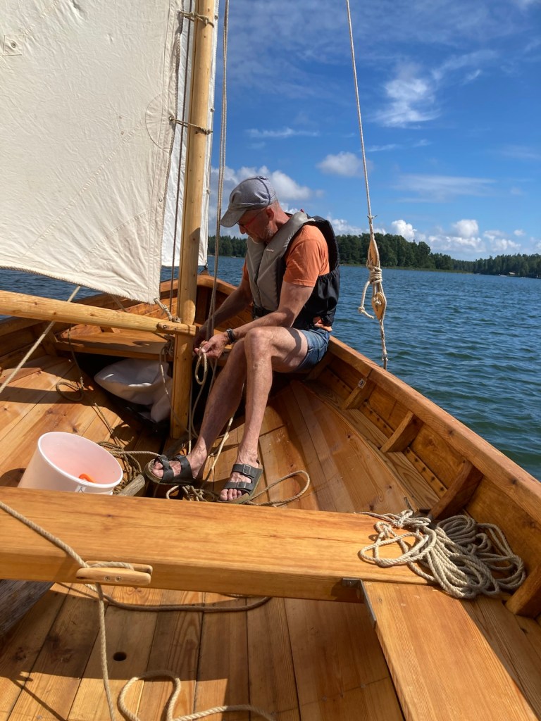 Det är den första gången med seglen i topp. Bommen är något för kort, liket blir löst. Det är svårt att spänna fall och stag, repen töjer. Långt är det fråga om ovana med denna typ av båt, grejorna är inte som på en modern kryssare. Men roligt är det!
