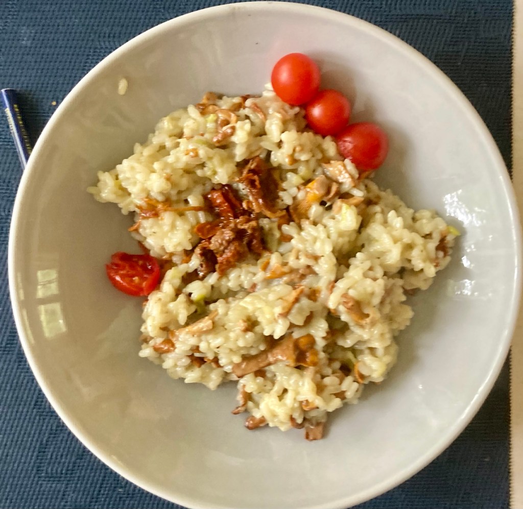 I stugan tillreder han en risotto på svamp han plockat tidigare. Tomaterna är också från egna odlingar trots att de inte har fått vatten på två veckor. Anrättningen smakar gudomligt!