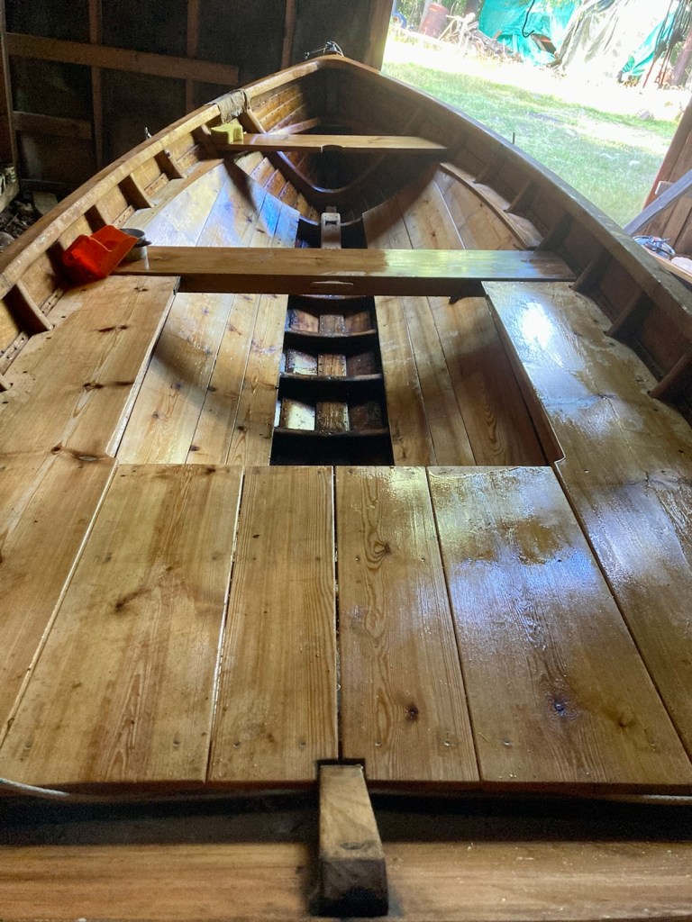 De nedersta garneringsbräderna skruvas loss på allmogejullen och kölsvinet (som inte heter så) putsas för hand. Får fortsätta nästa dag med effektivare verktyg.