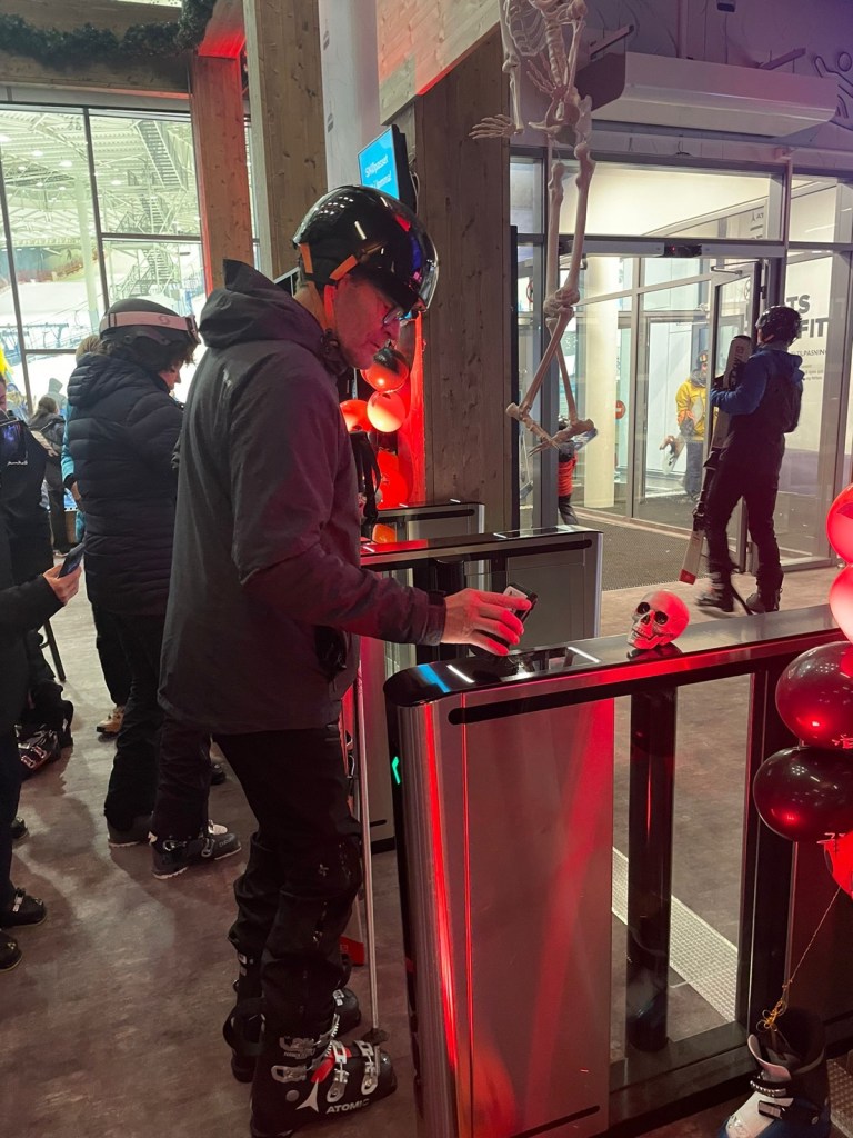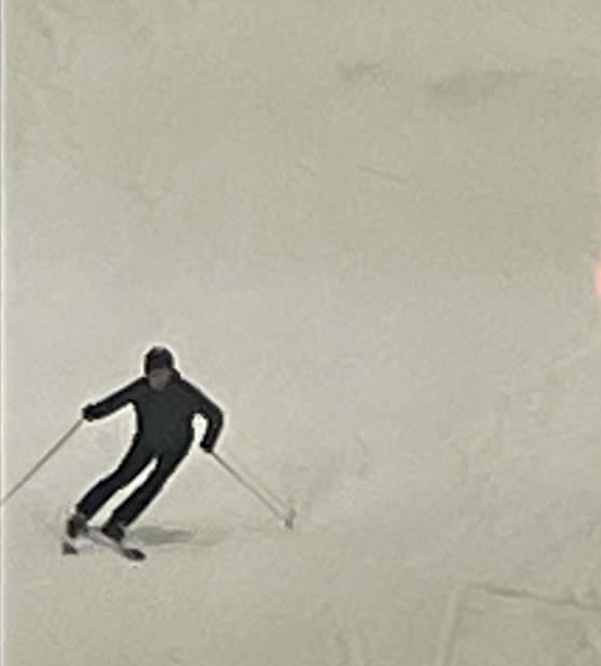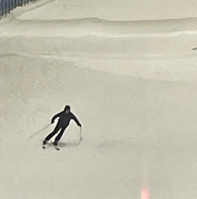 Följande dag följer Elvira honom till inomhus-skicentret Snø. Han hyr utrustning och beger sig ut i branten.