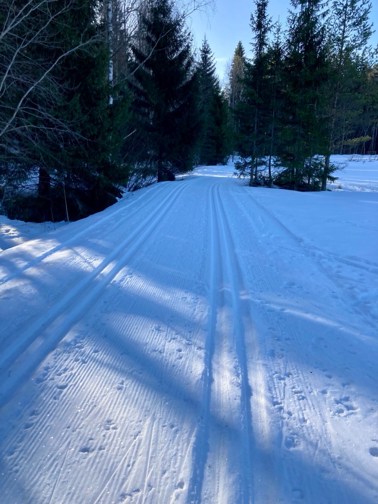 Nätterna är ännu kalla, så om man är tidigt ute är spåren isiga och snabba. Han besöker nu Pirttibacka för första gången denna säsong och ser via omvägar till att totalsträckan blir 20 km.