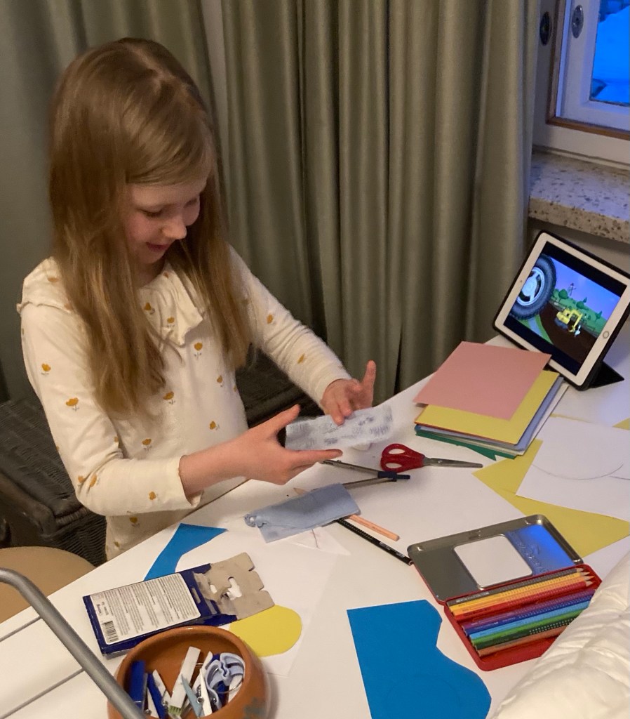 Efter simskolan har det blivit pysselkväll hos farfar.
