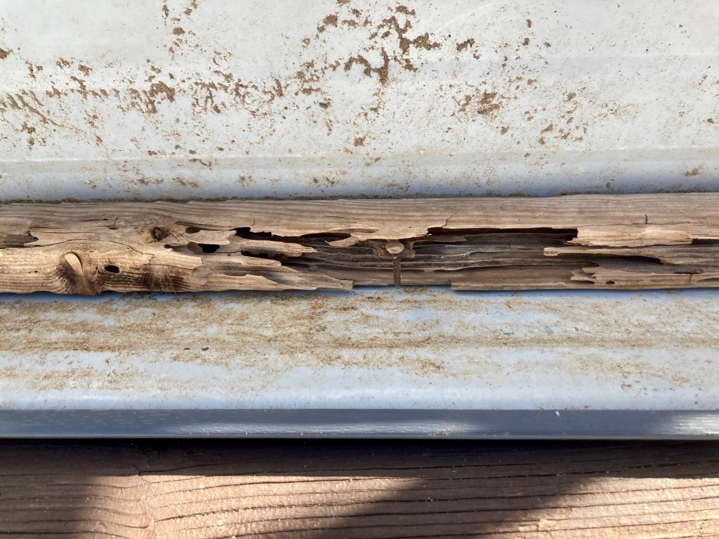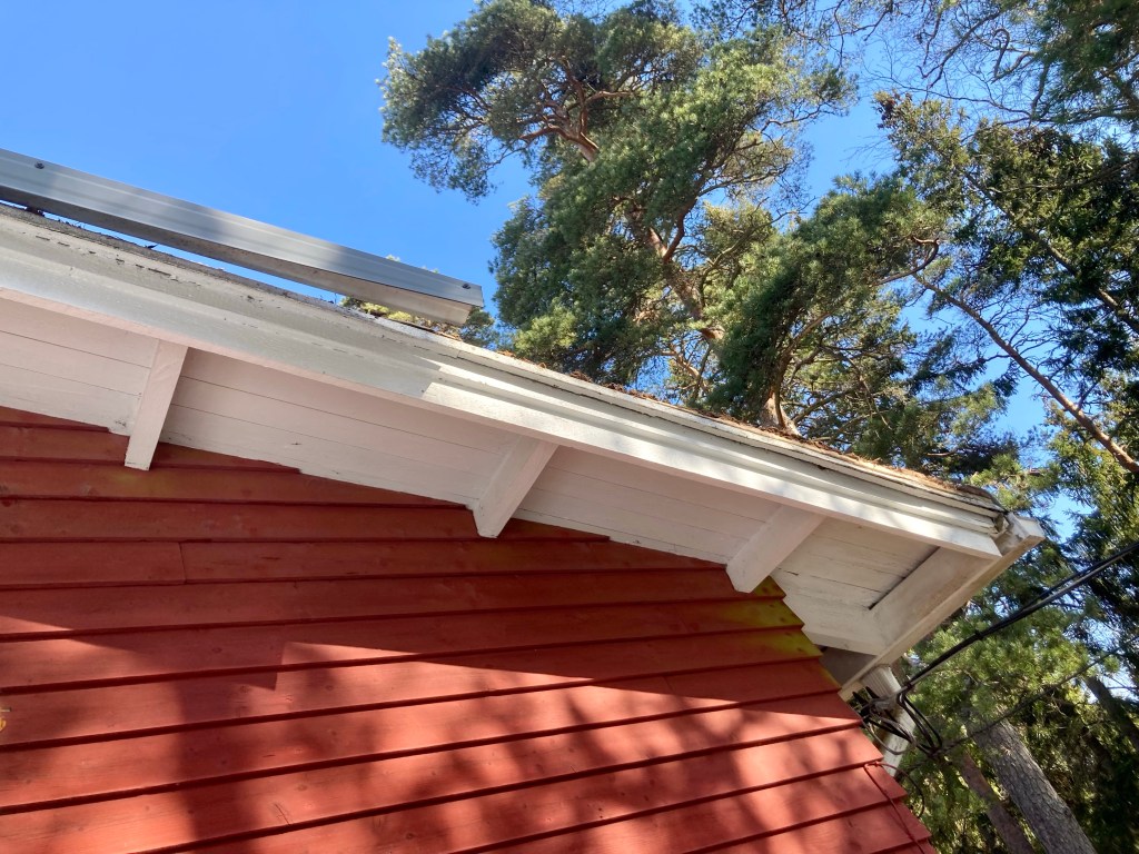 Plåttakets gavellist har lossnat. Träribban den suttit fast vid har angripits av myror och fukt som trängt sig in.