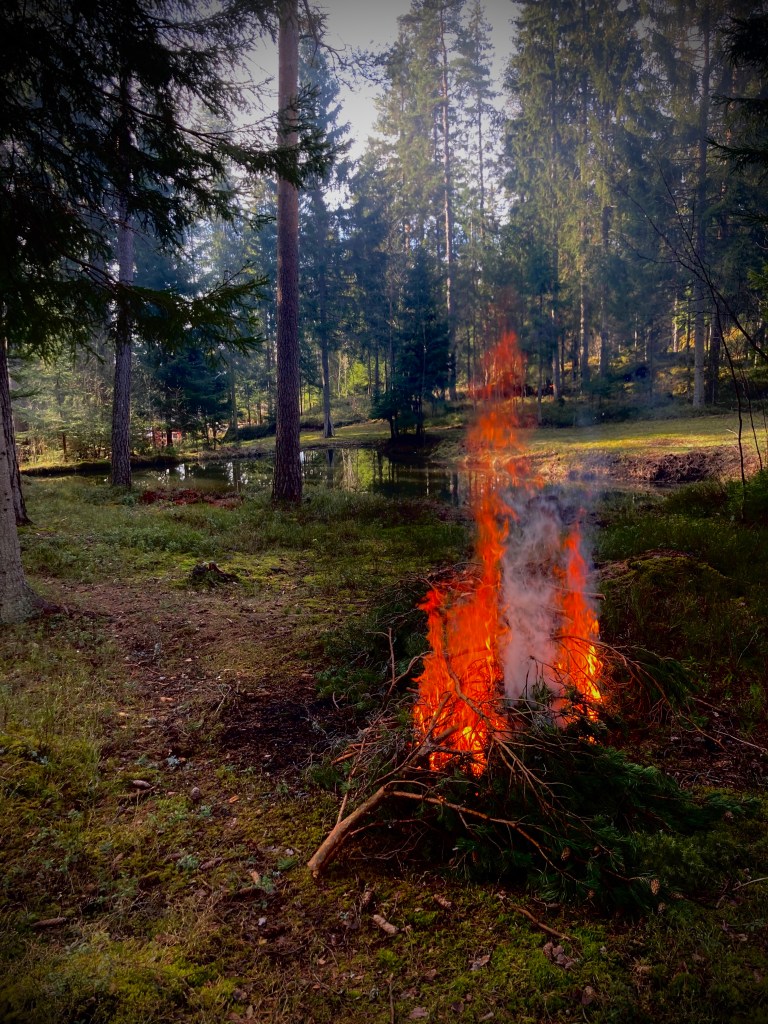 Att bränna är en tillfredsställande sysselsättning. Ledda av röken kommer Gunvald och Timo för att språka. Grannsämjan är god.