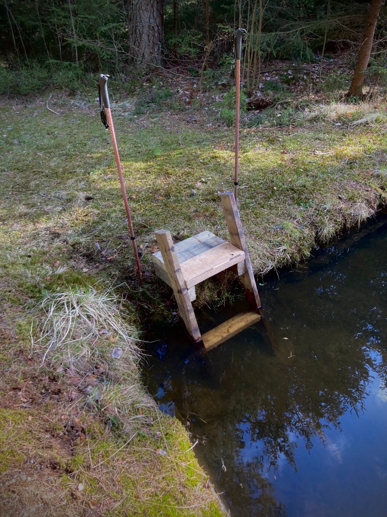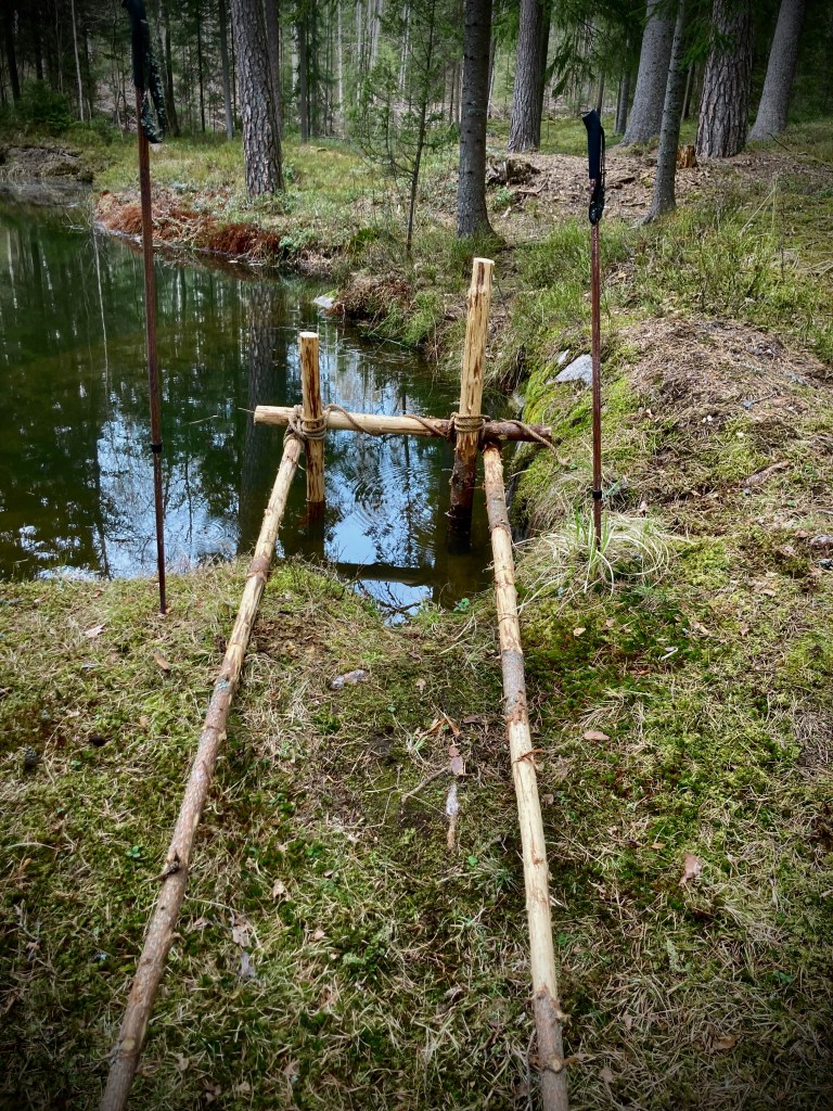 En stege för att stiga i potten planeras. Han har sänkt sig i tjärnen efter bastun ända sedan isen lättat i kanterna.