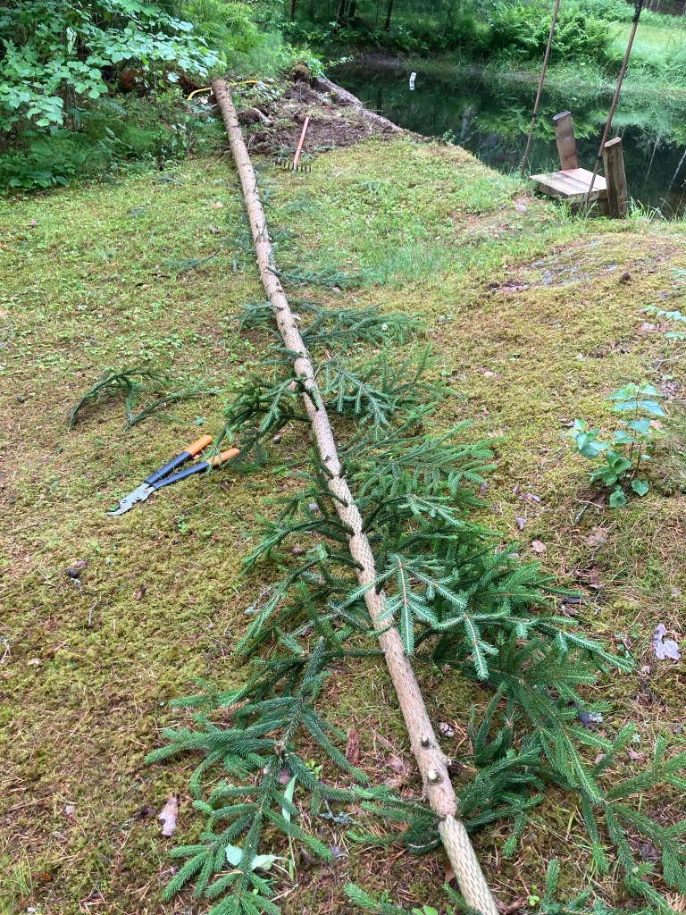 Sagt och gjort, efter dagens behandling åker han till stugan. Ingen granne syns till, så i brist på annat fäller han en gran som står nära projektmuren.